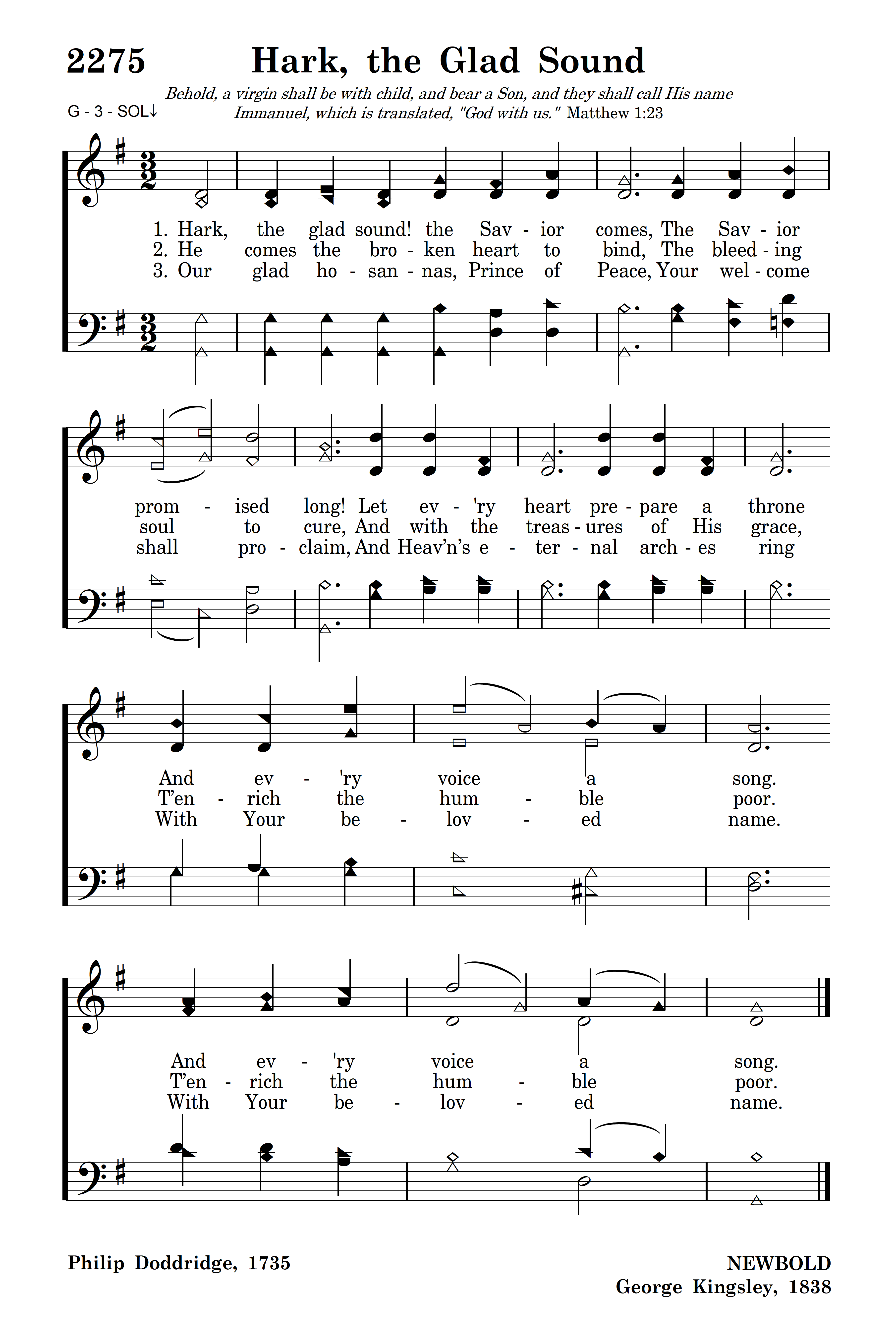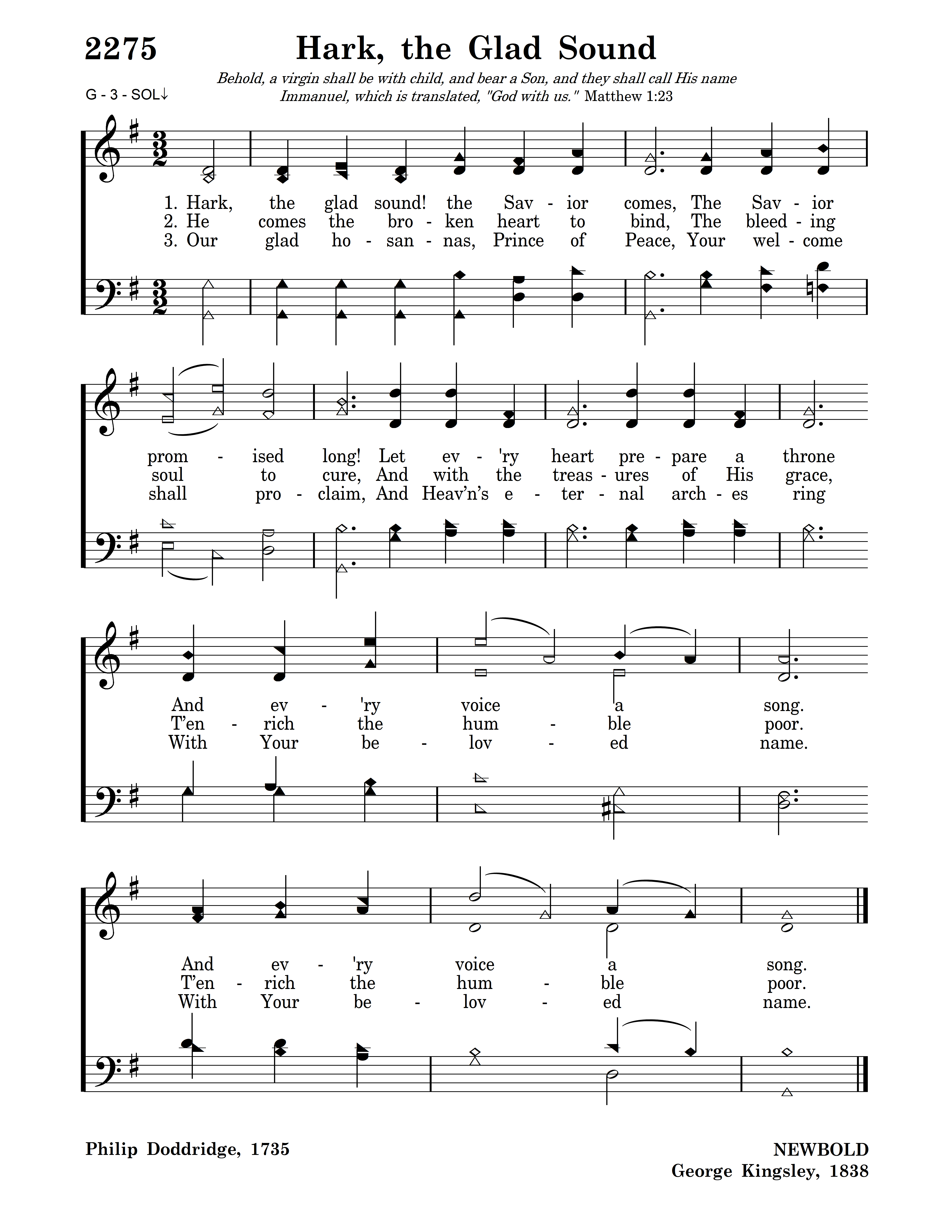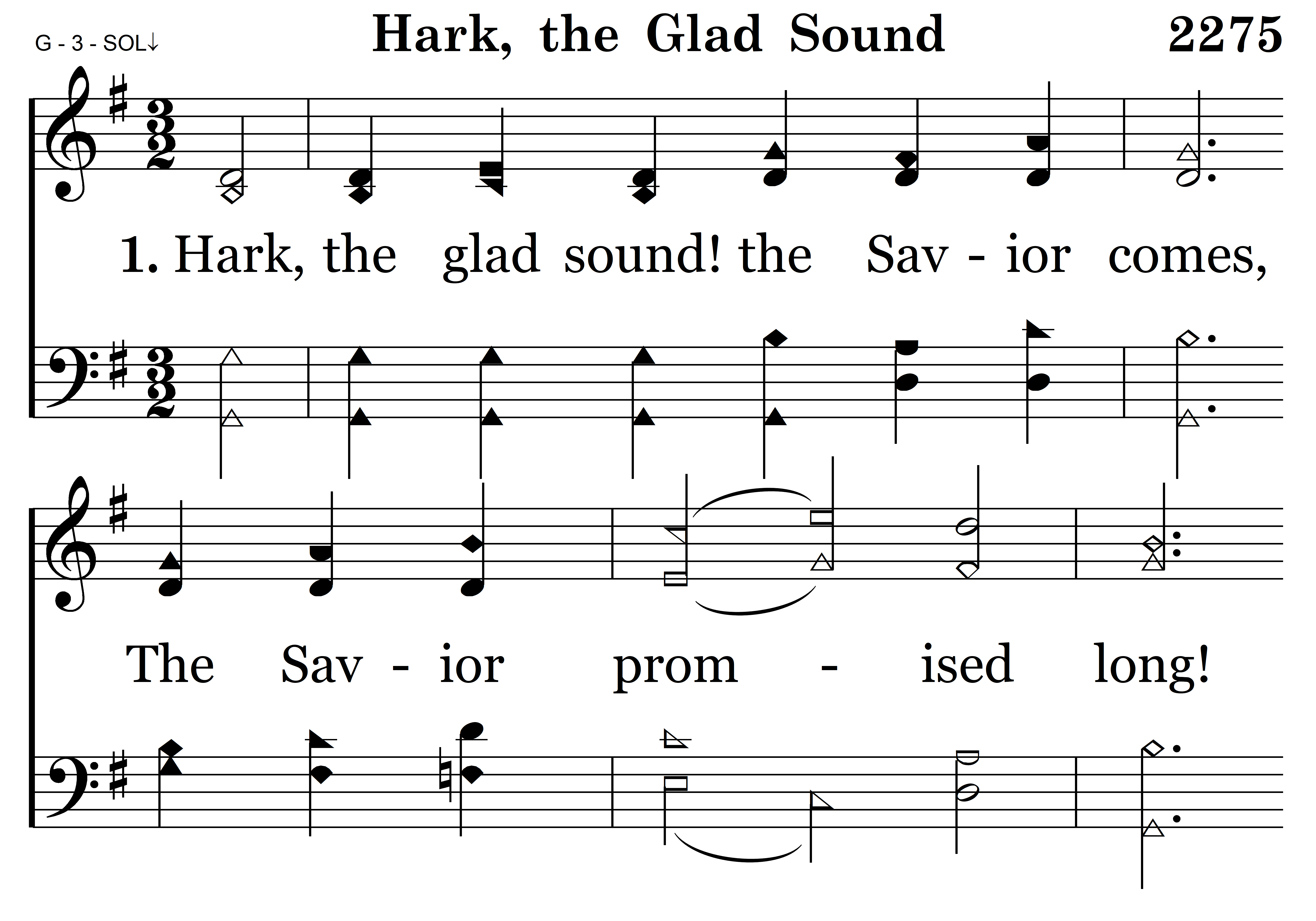 Hark, the glad sound! the Savior comes, The Savior promised long! Let ev'ry heart prepare a throne