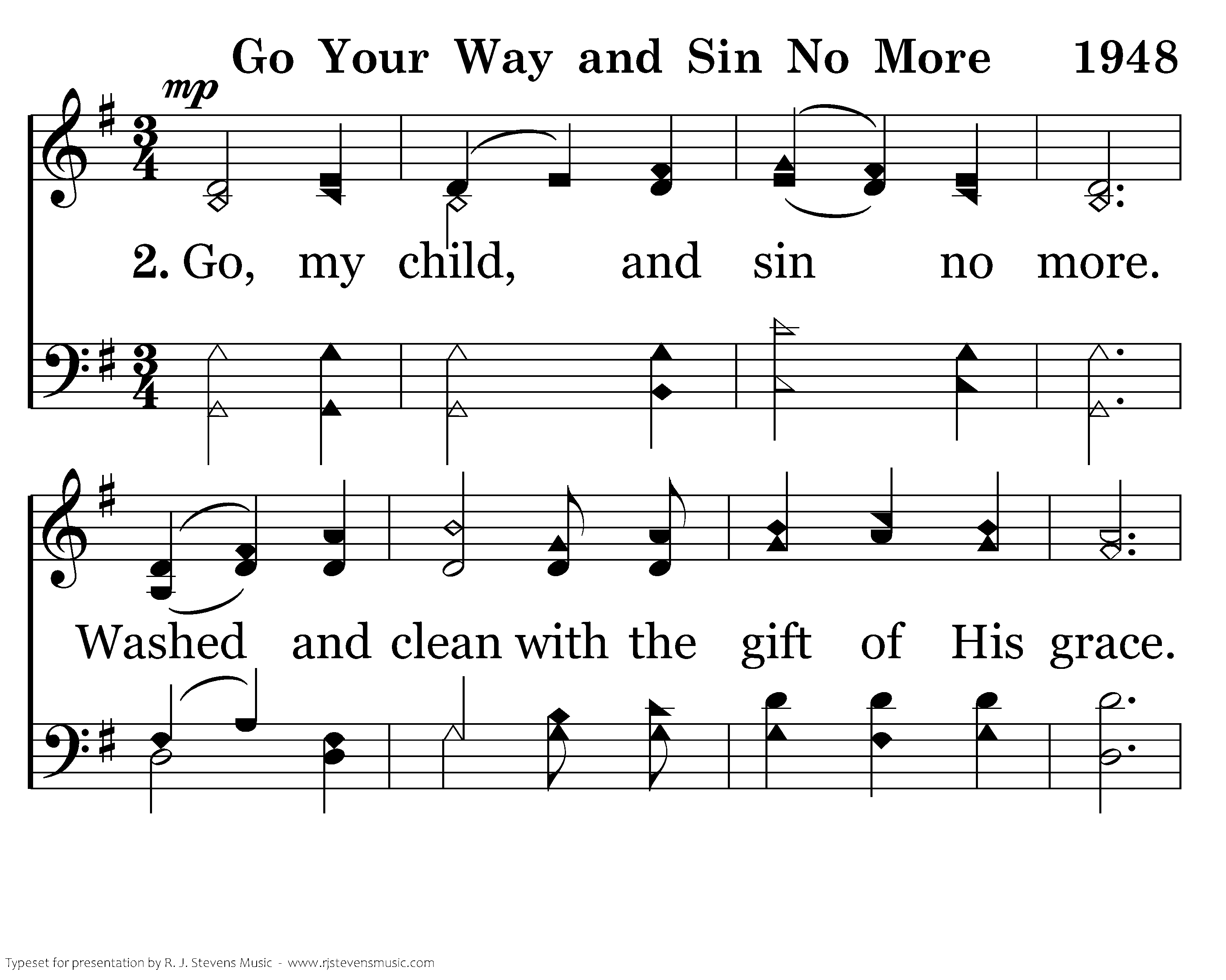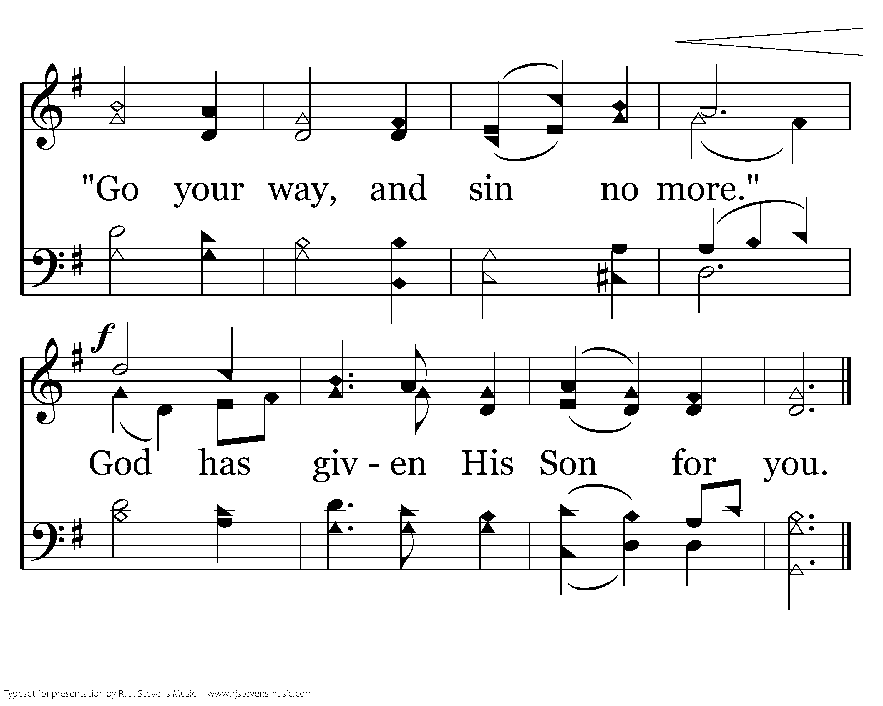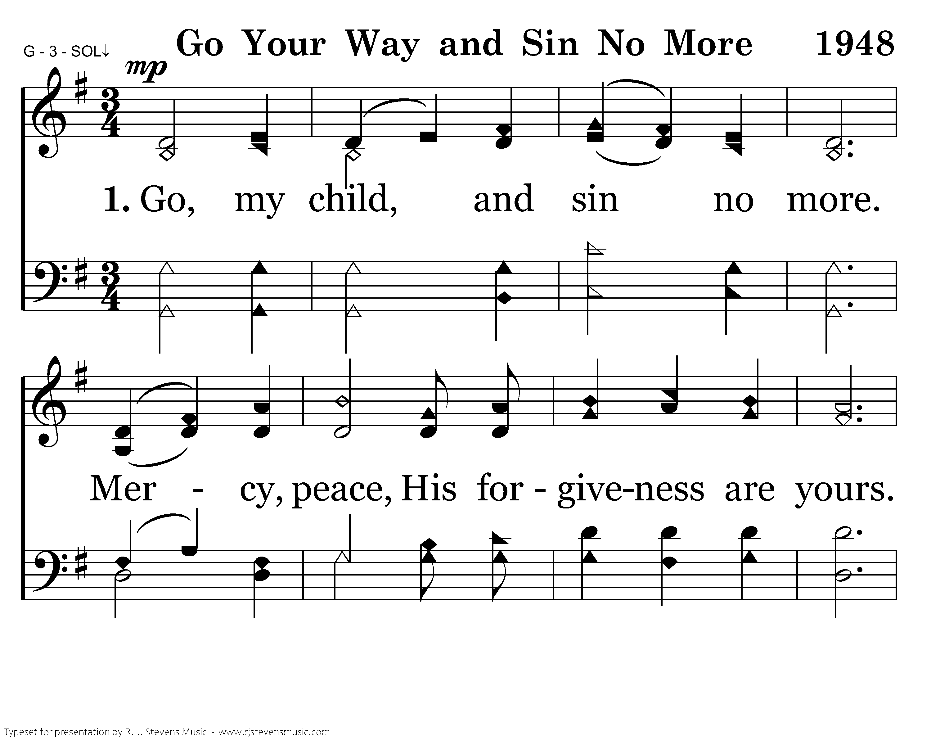 Go, my child, and sin no more. Mercy, peace, His forgiveness are yours. 'Go your way and sin no more." God has given His Son for you.