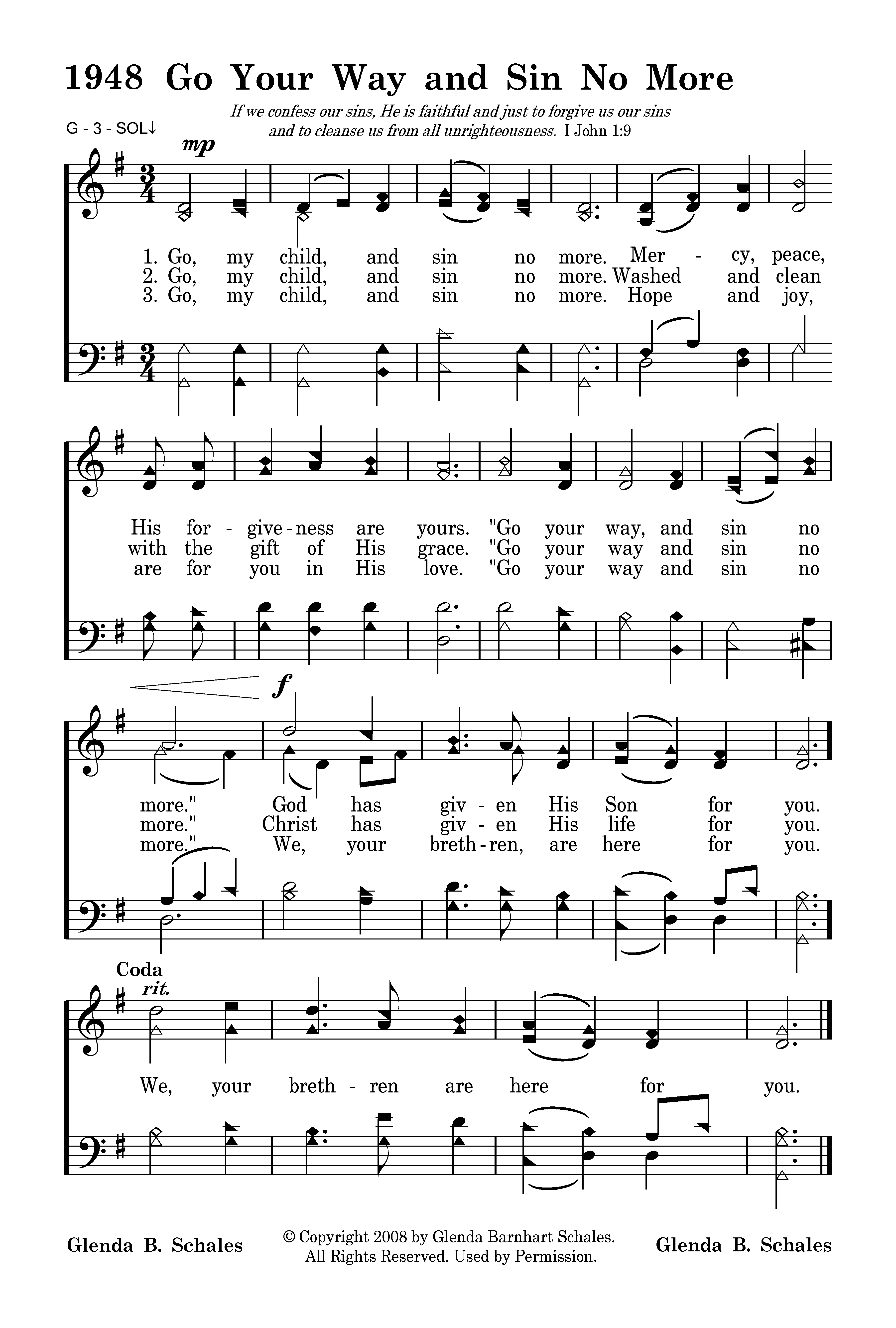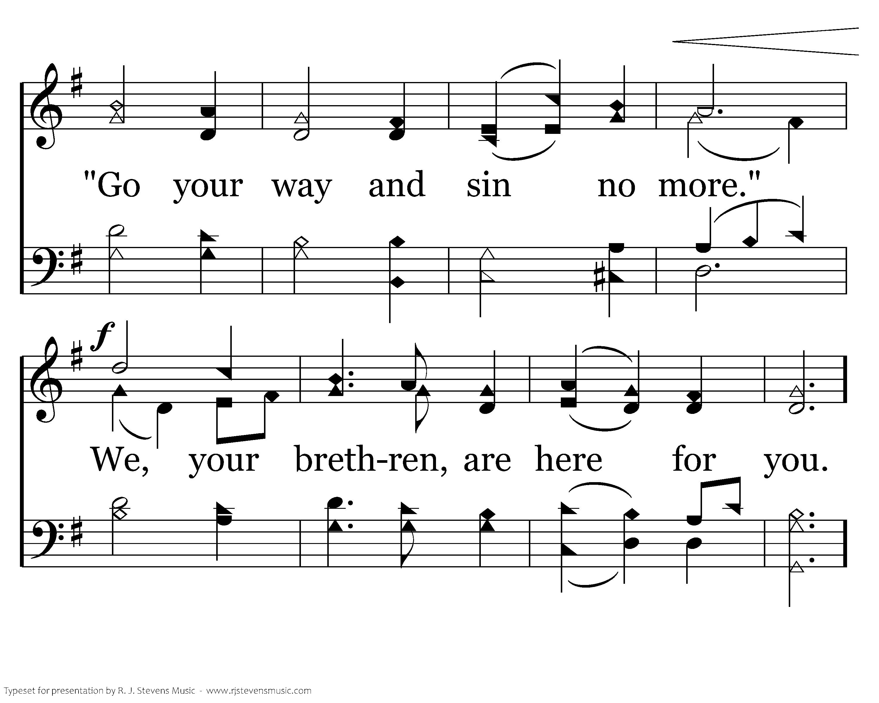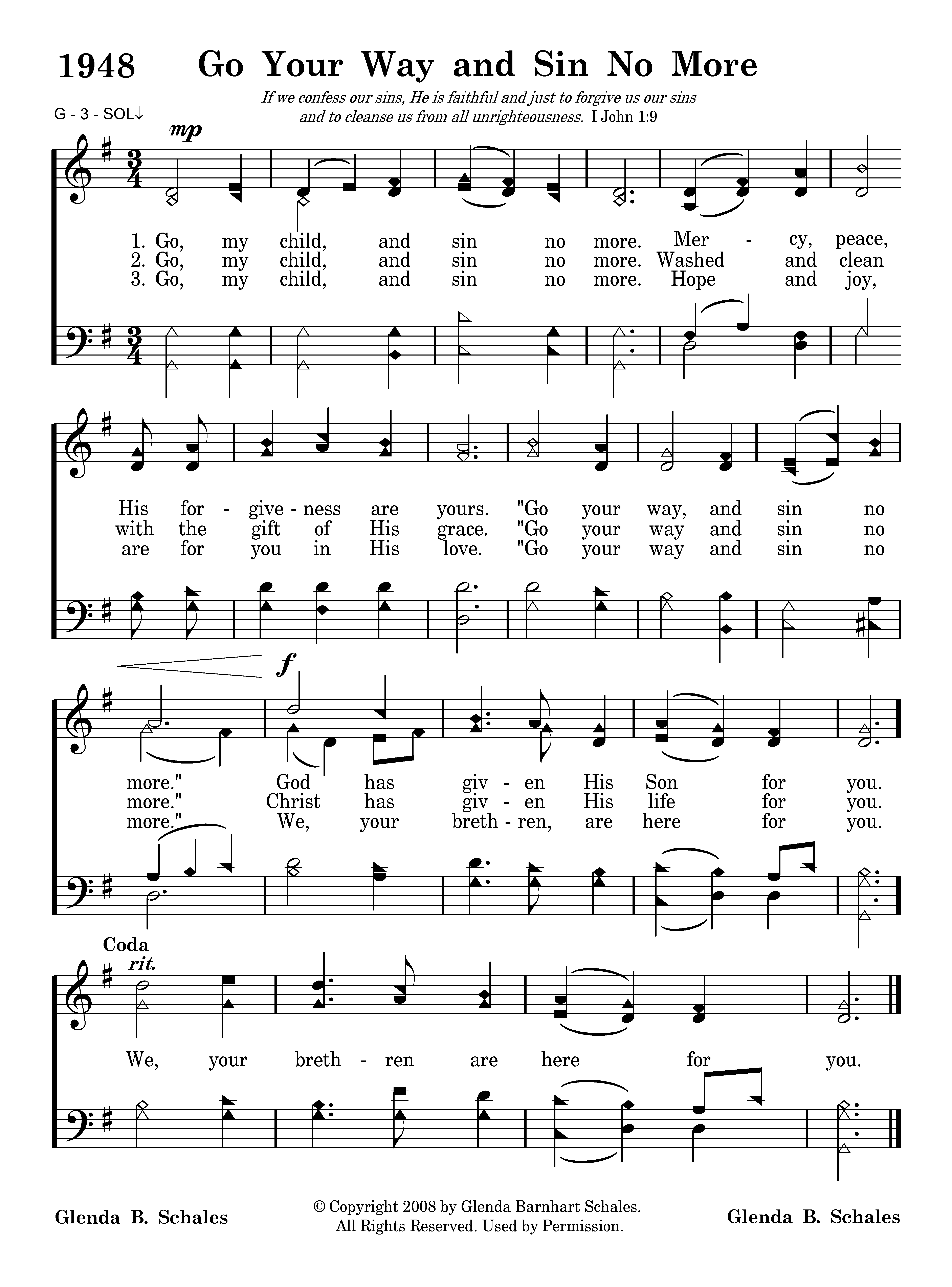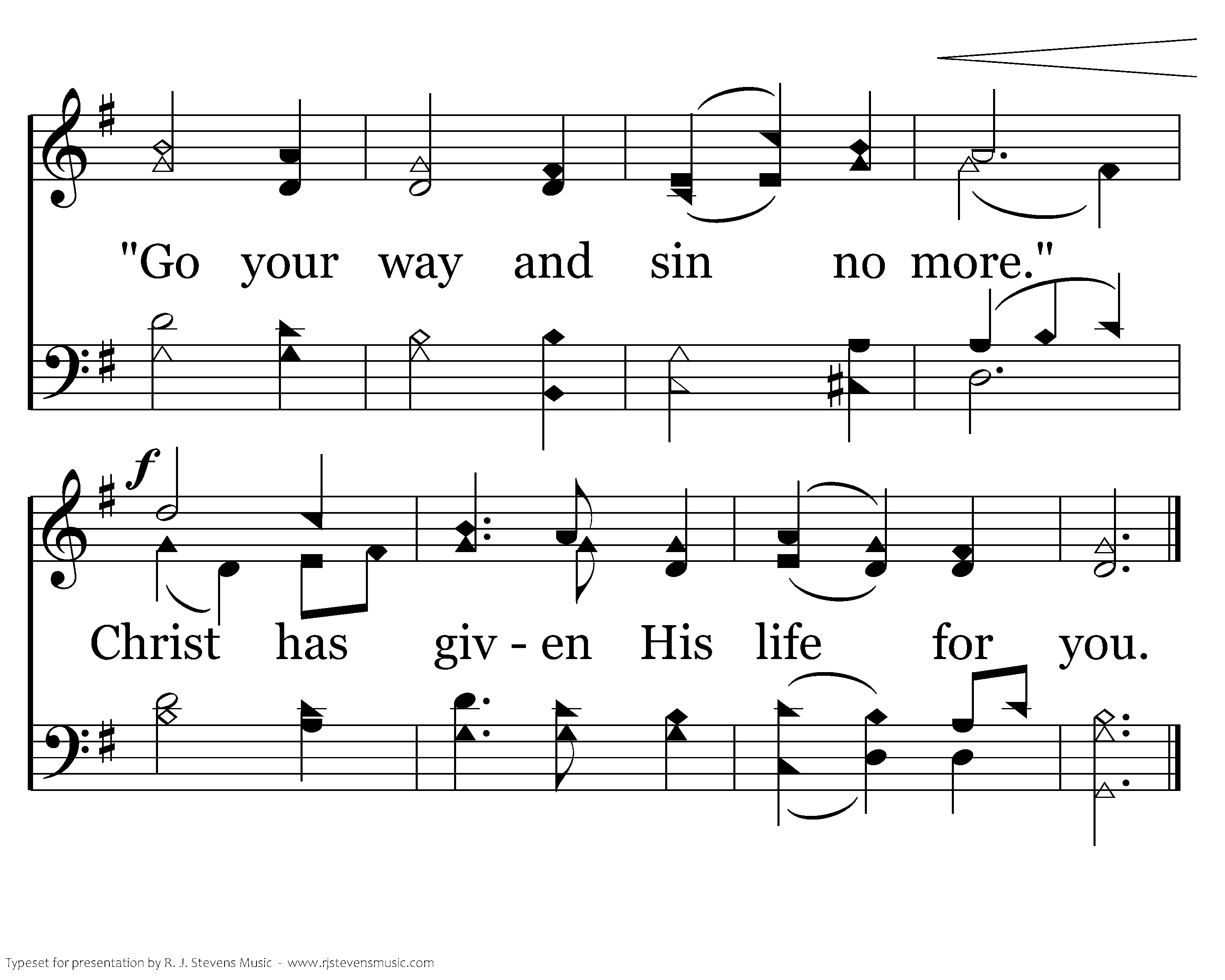 Go, my child, and sin no more. Mercy, peace, His forgiveness are yours. 'Go your way and sin no more." God has given His Son for you.