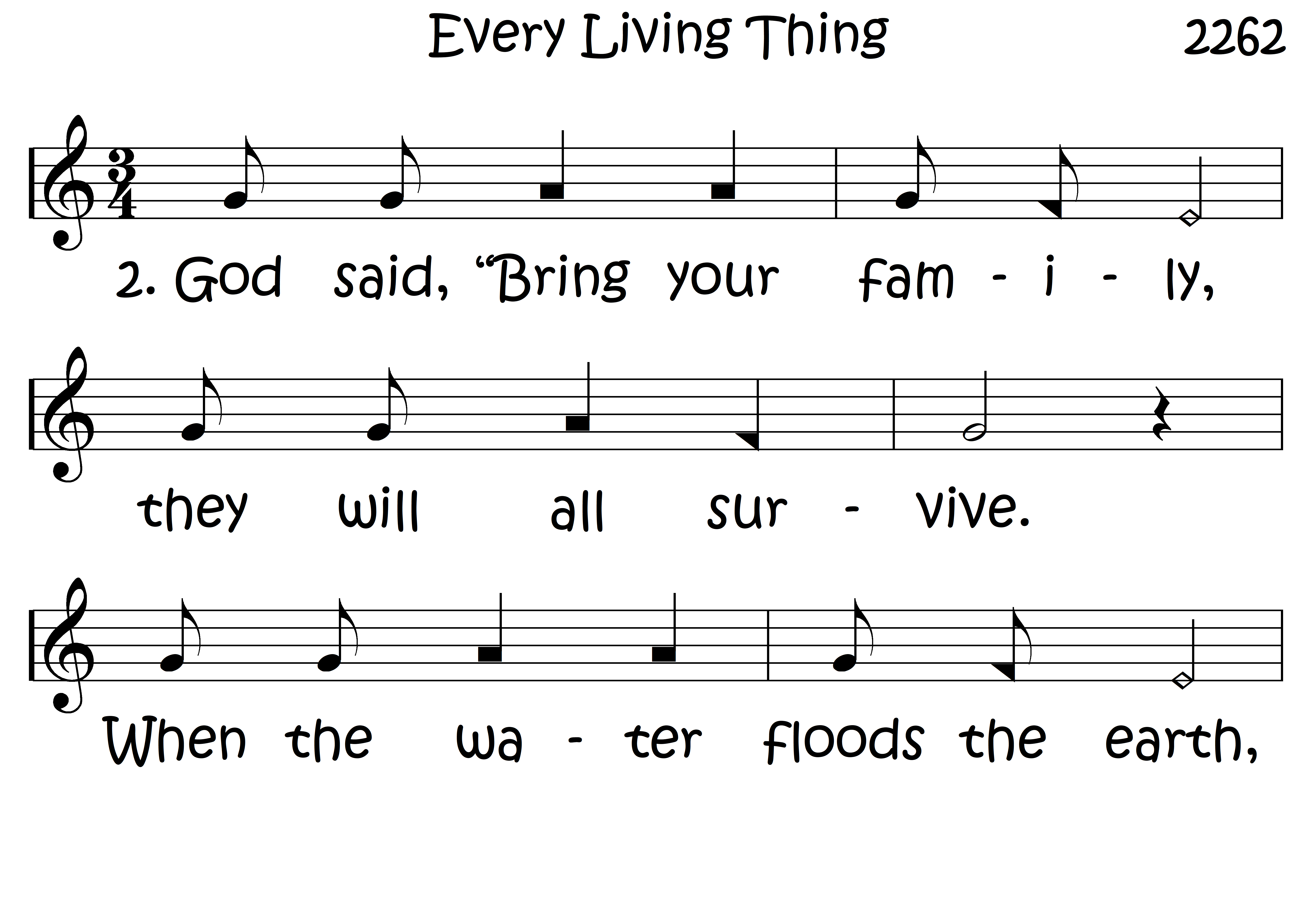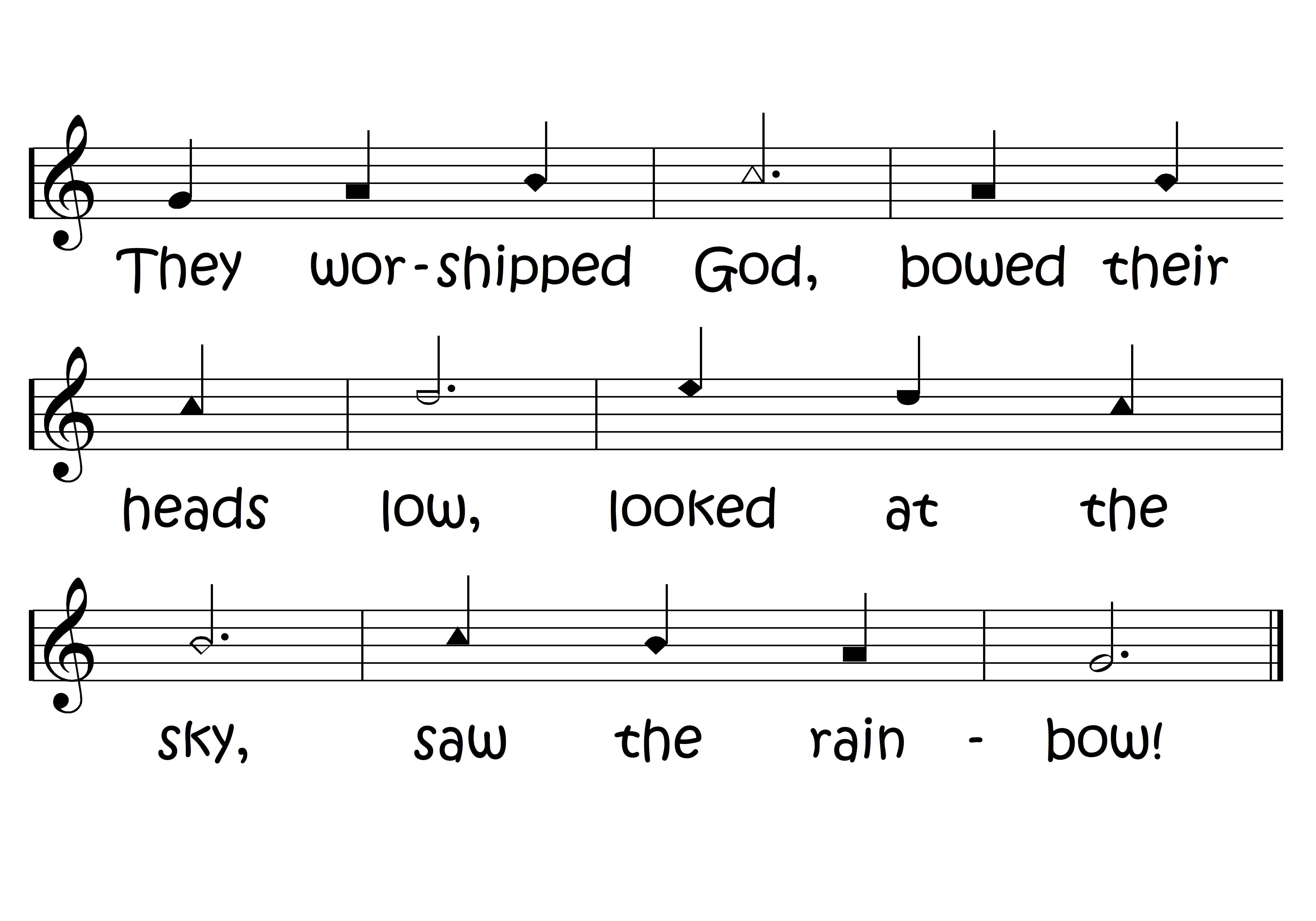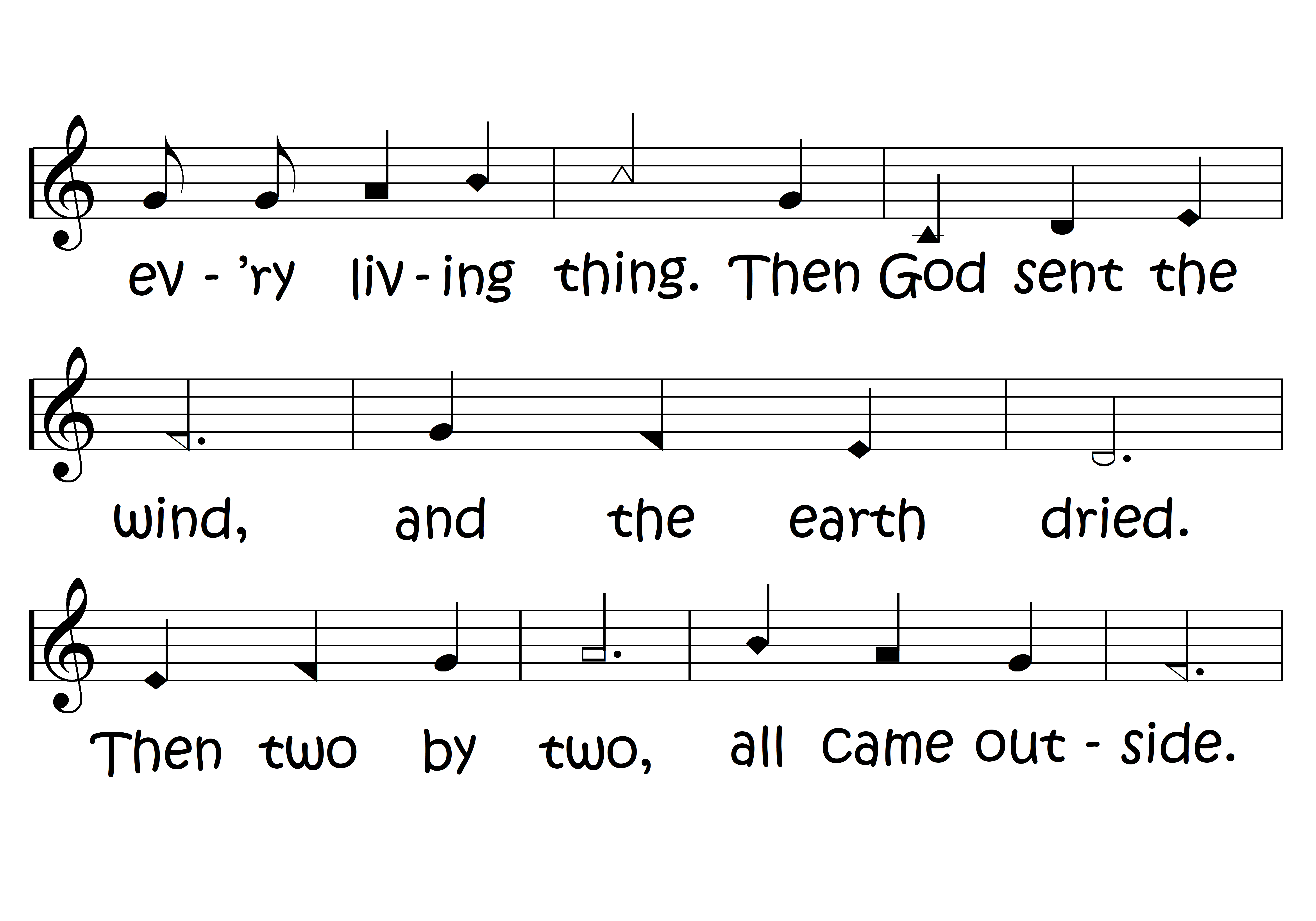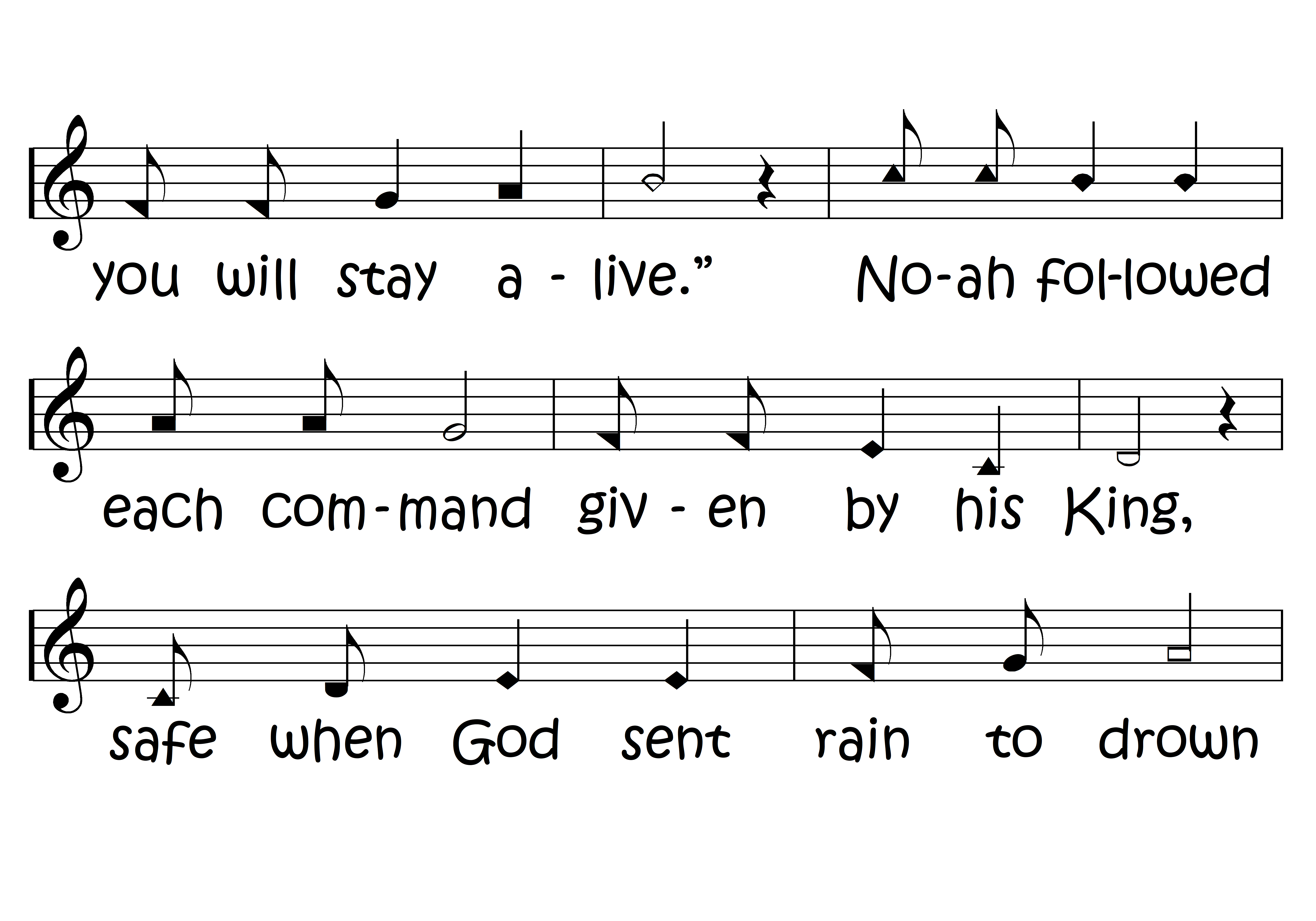 God said, “Bring your family, they will all survive. When the water floods the earth, you will stay alive.” Noah followed each command given by his King, safe when God sent rain to drown ev’ry living thing. Then God sent the wind, and the earth dried. Then two by two, all came outside. They worshipped God, bowed their heads low, looked at the sky, saw the rainbow!