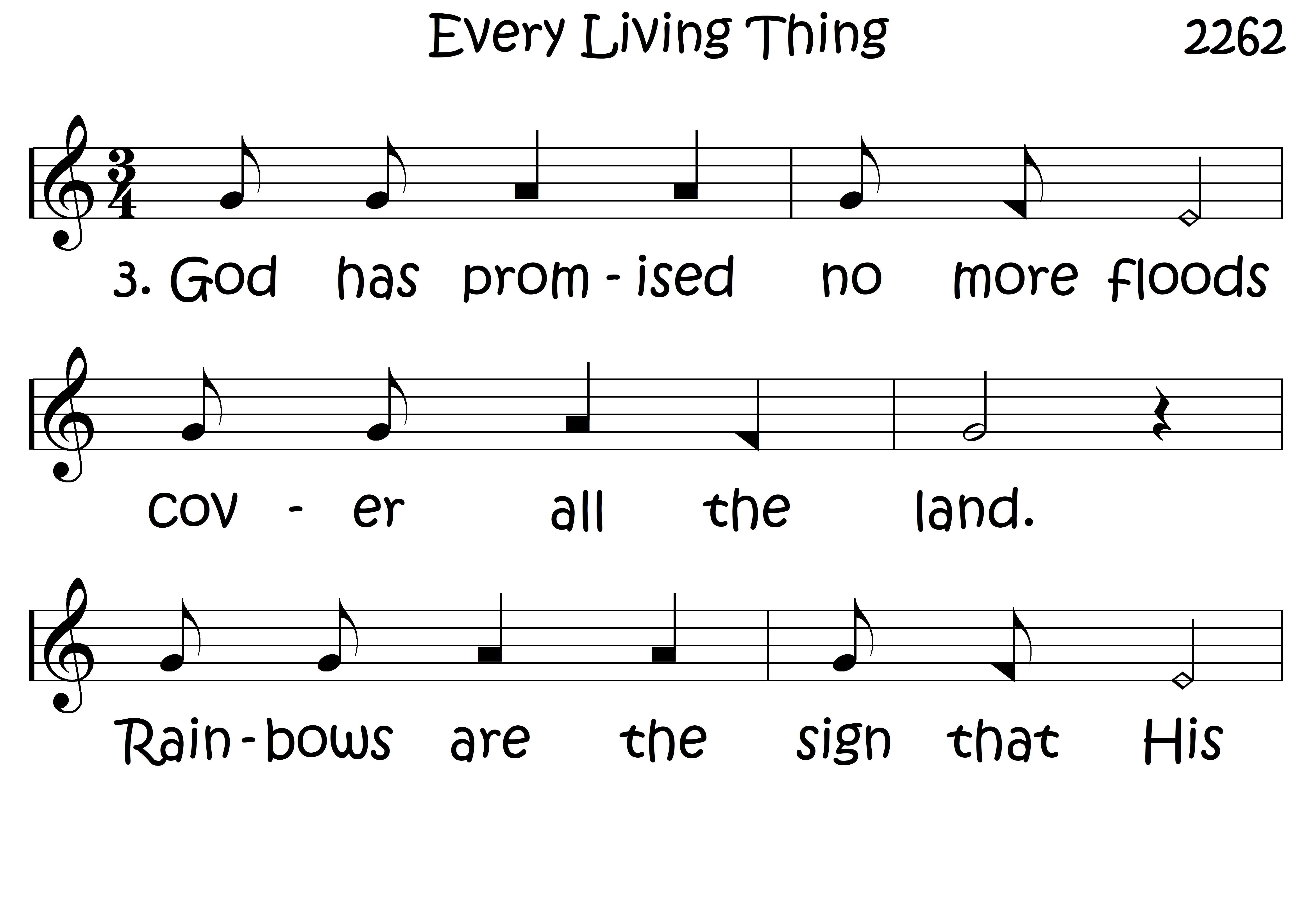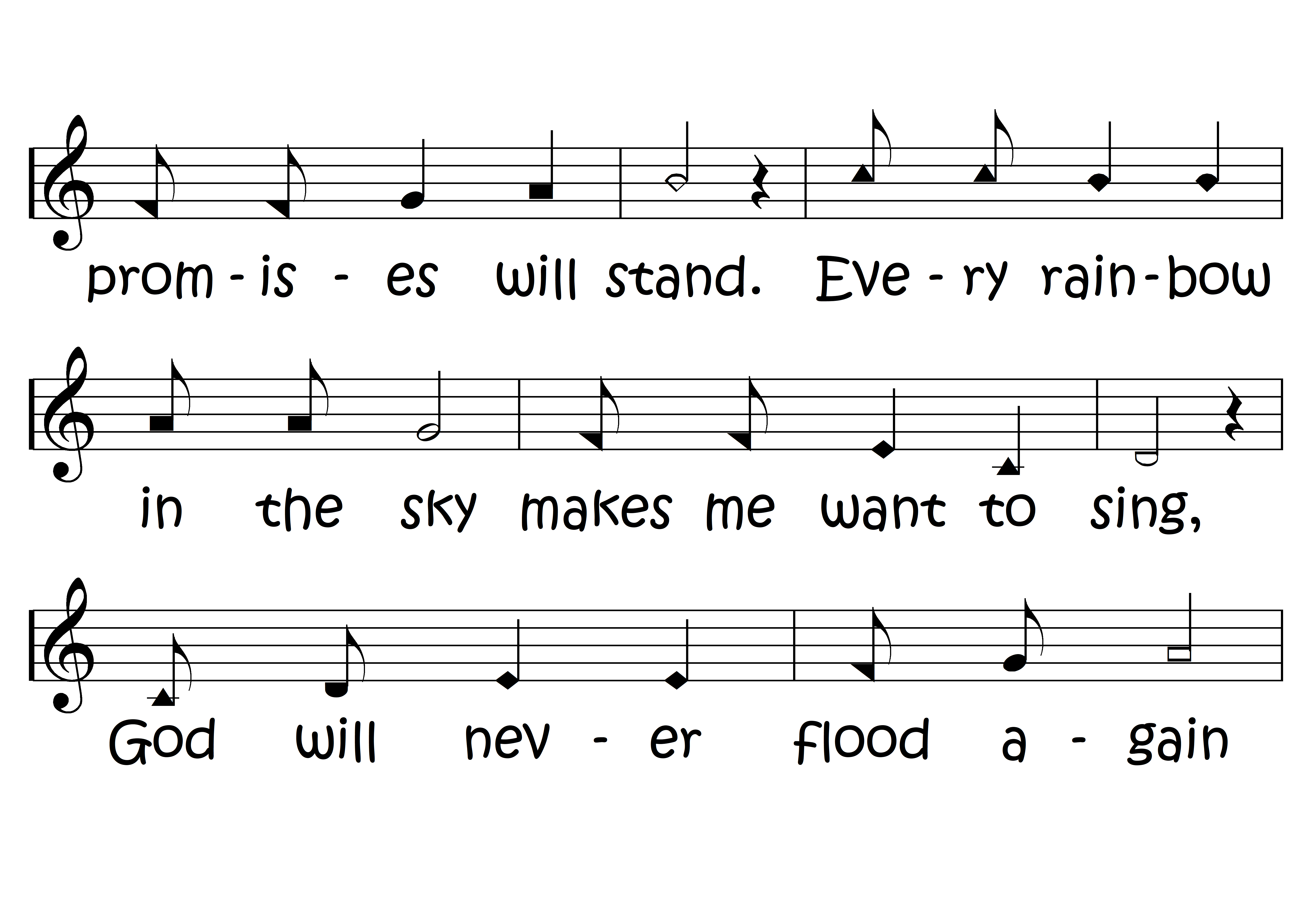 God has promised no more floods cover all the land. Rainbows are the sign that His promises will stand. Every rainbow in the sky makes me want to sing, God will never flood again ev’ry living thing!