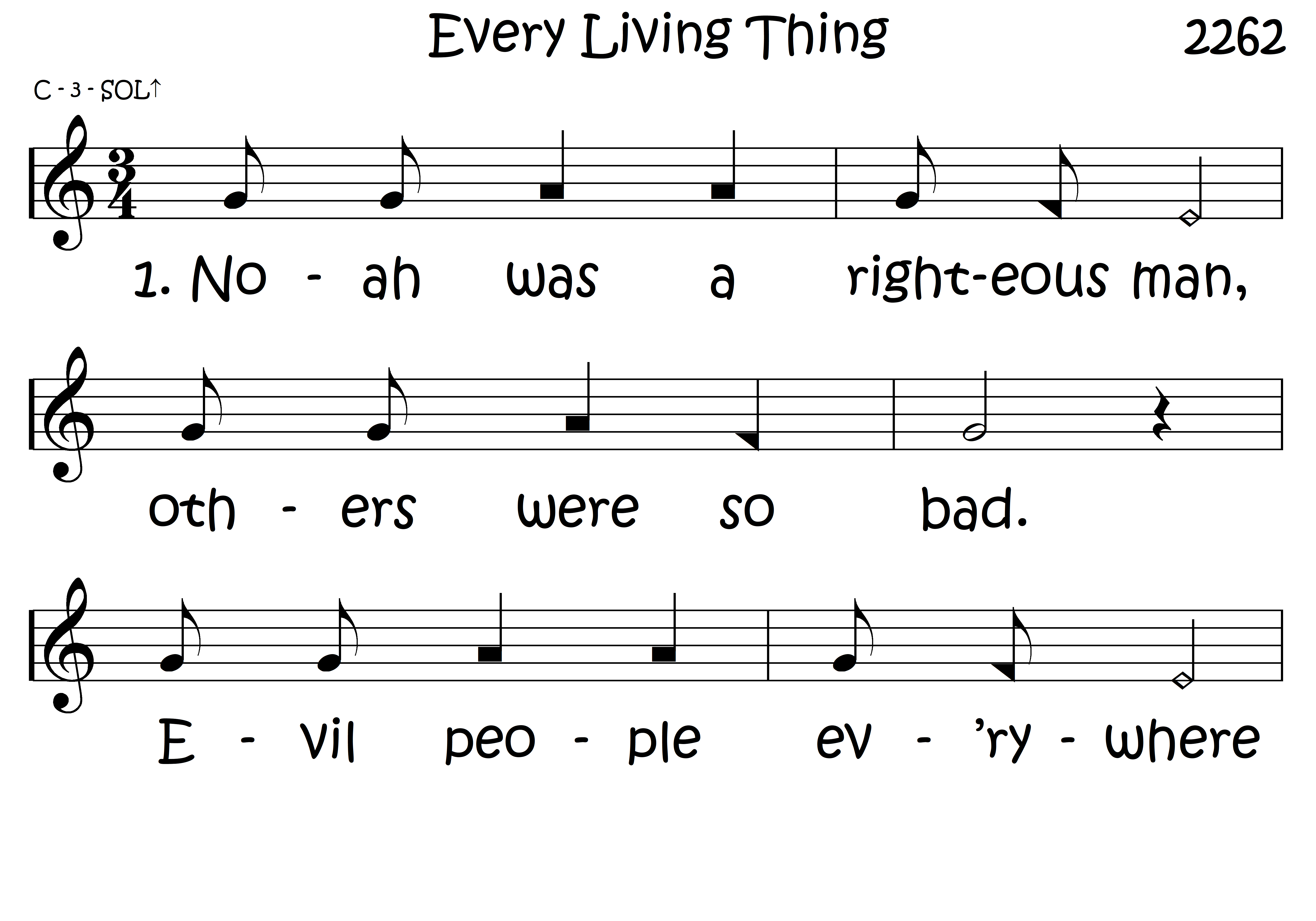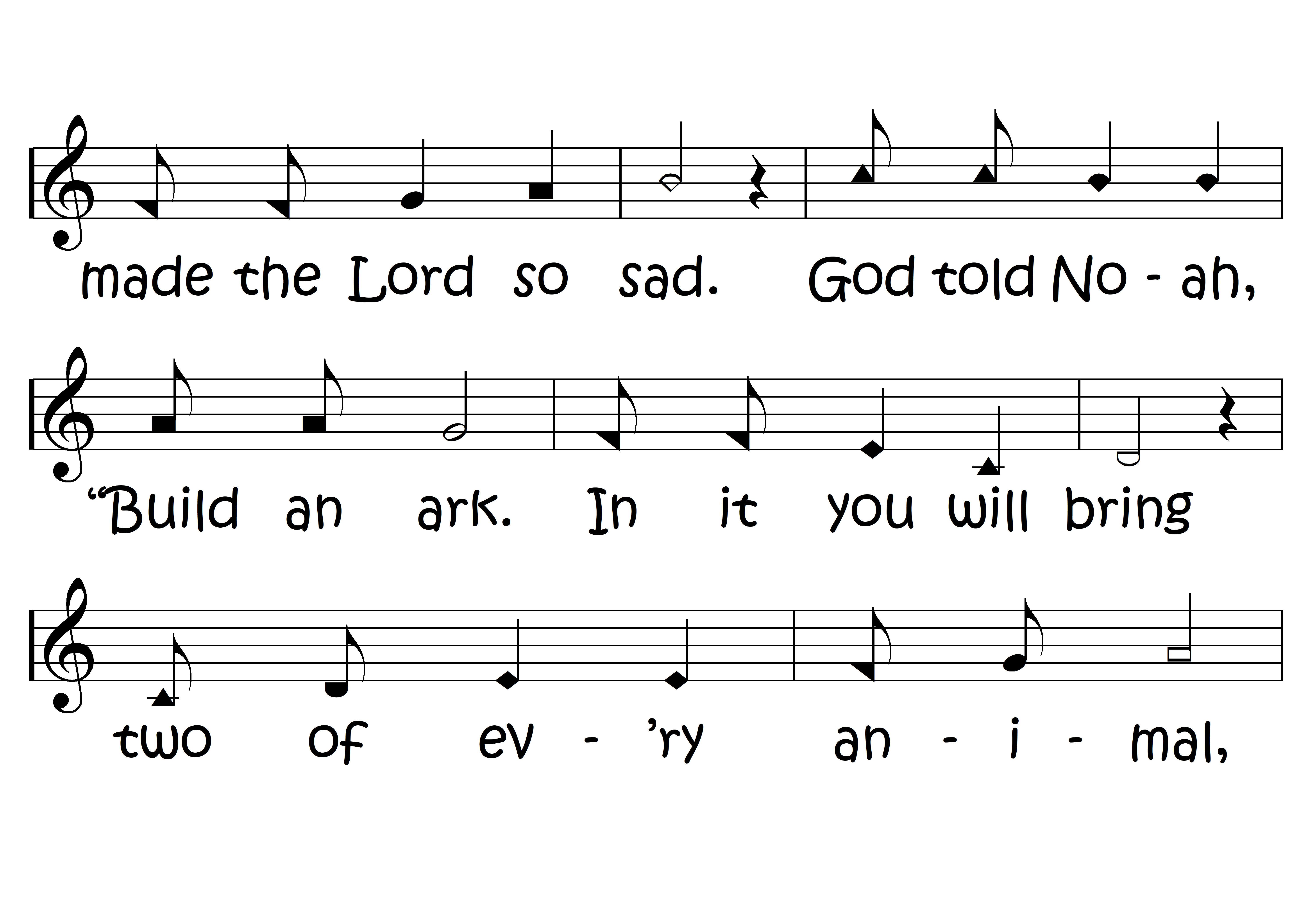 Noah was a righteous man, others were so bad. Evil people ev’rywhere made the Lord so sad. God told Noah, “Build an ark. In it you will bring two of ev’ry animal, ev’ry living thing.”