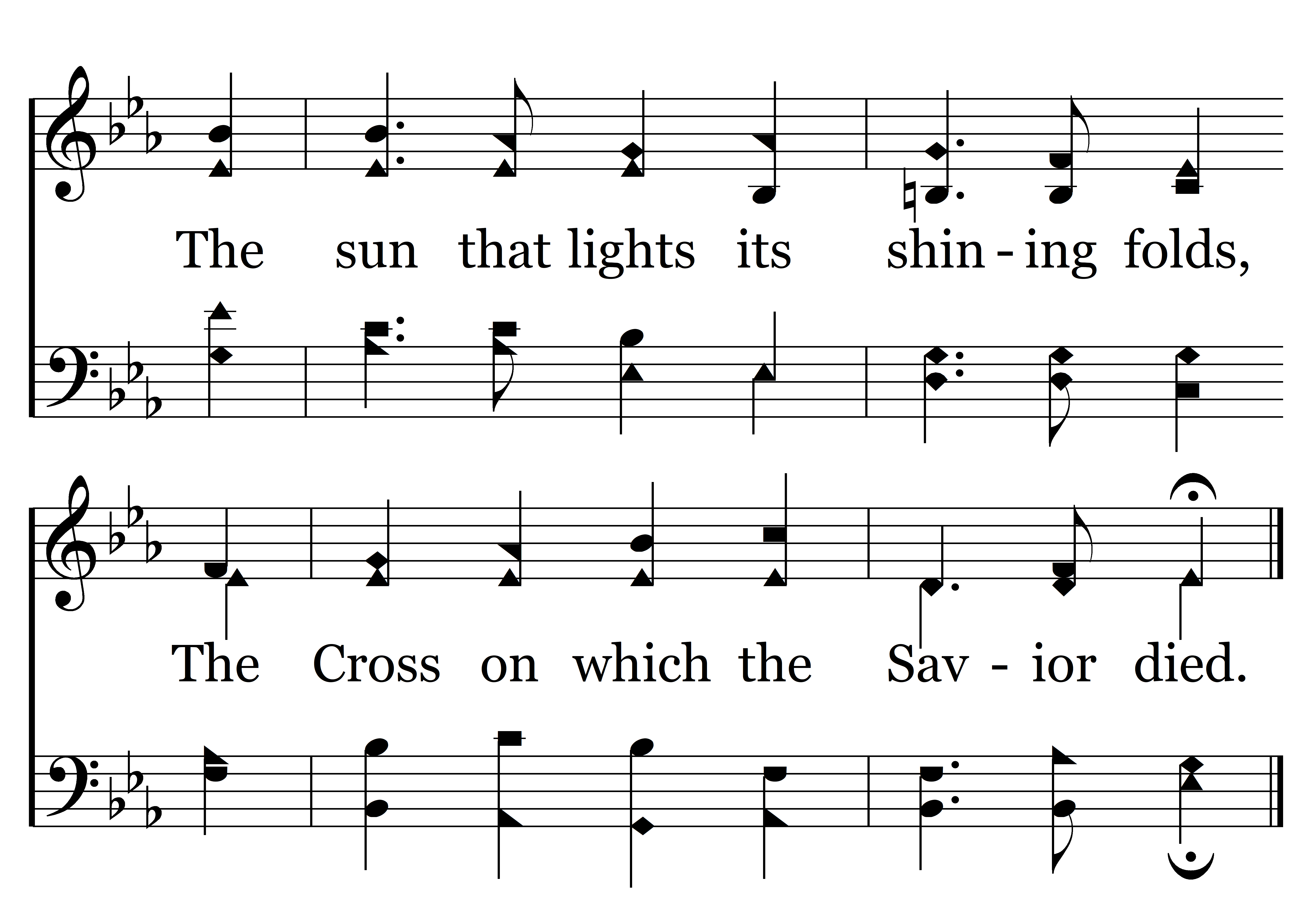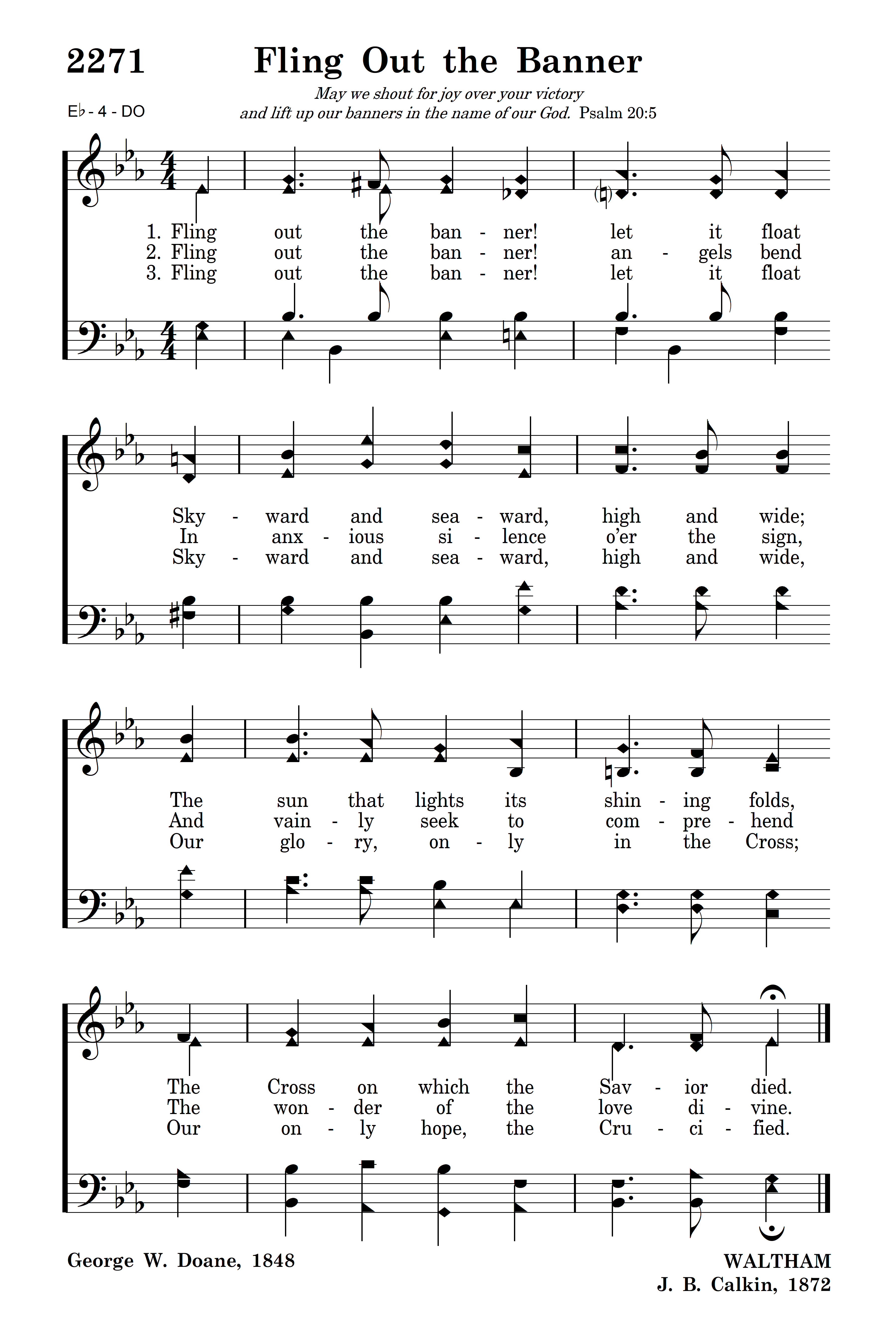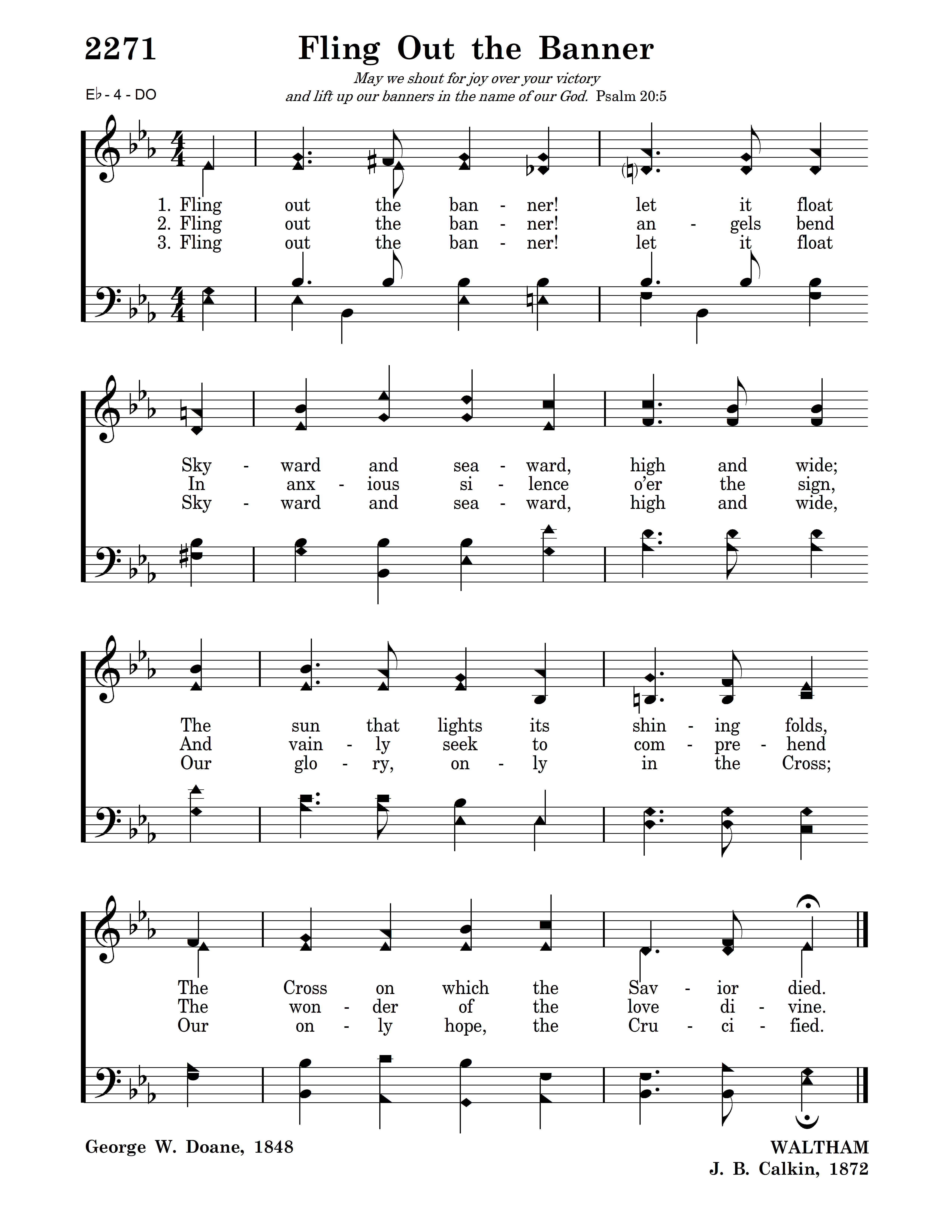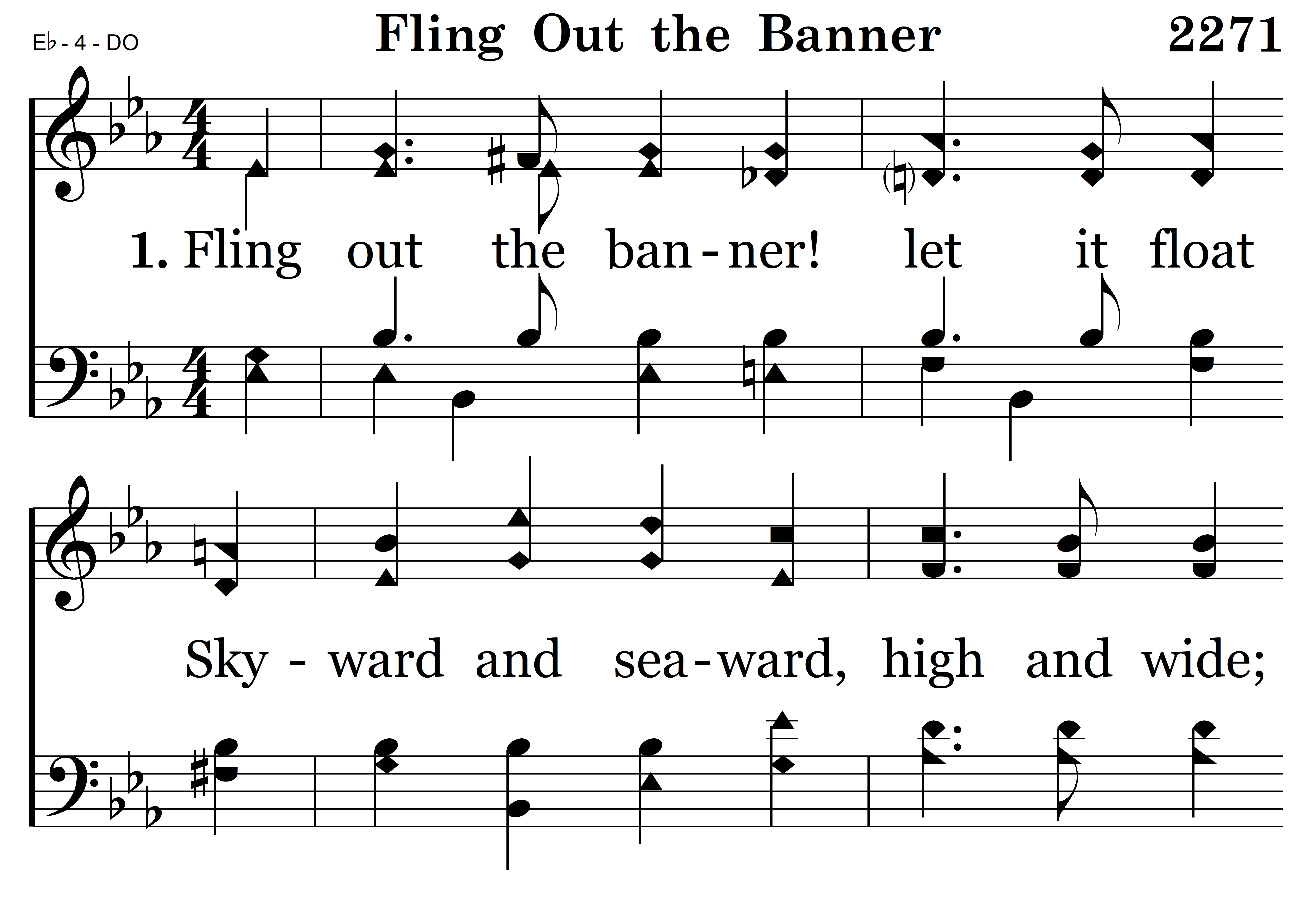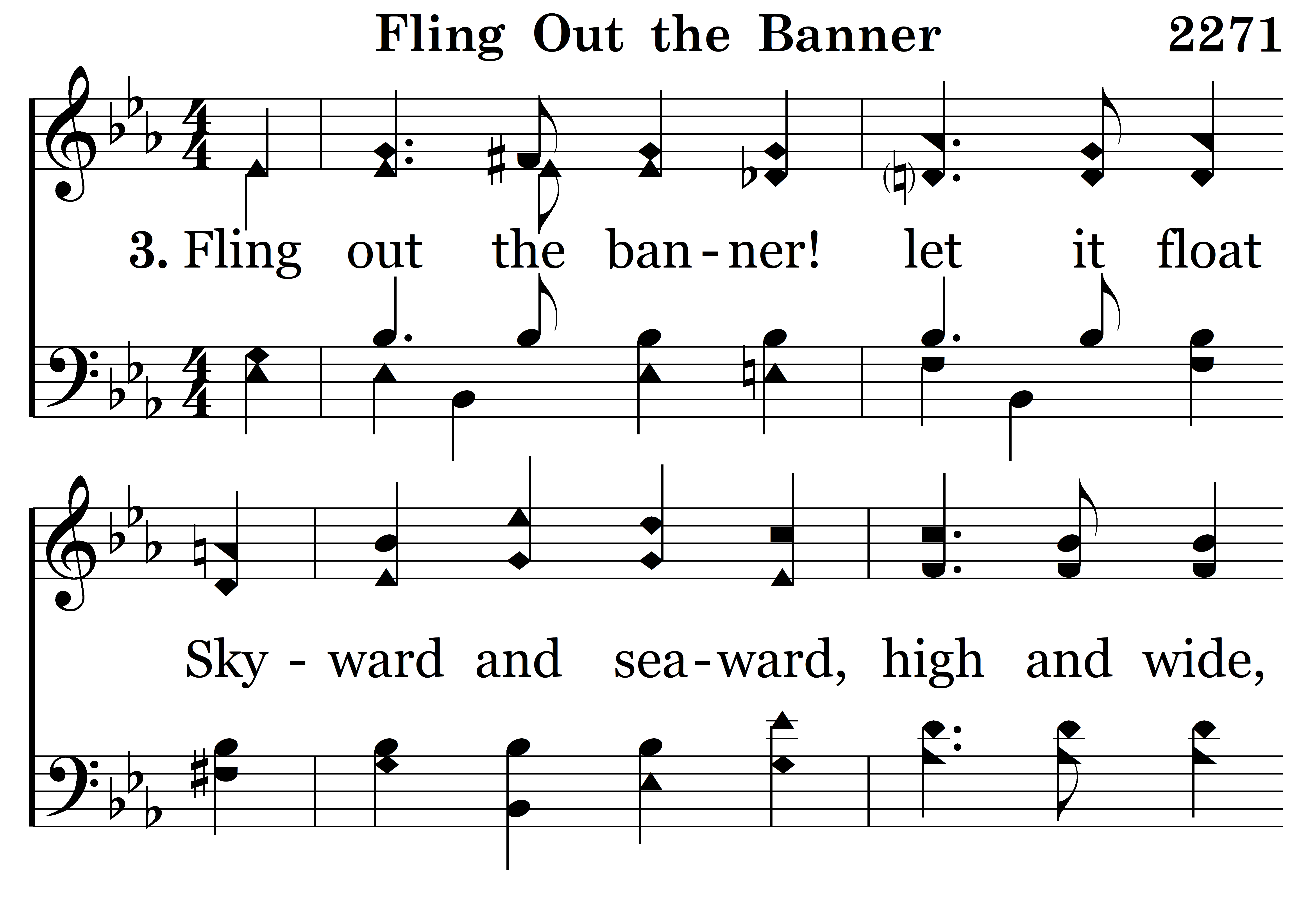 Fling out the banner! let it float Skyward and seaward, high and wide; The sun that lights its shining folds, The Cross on which the Savior died.