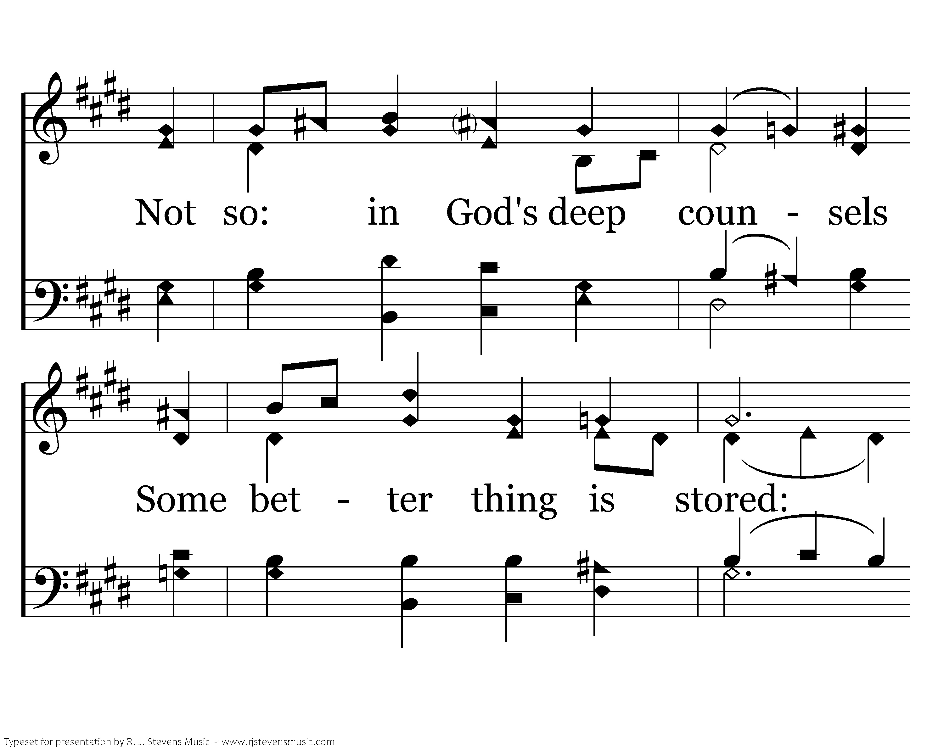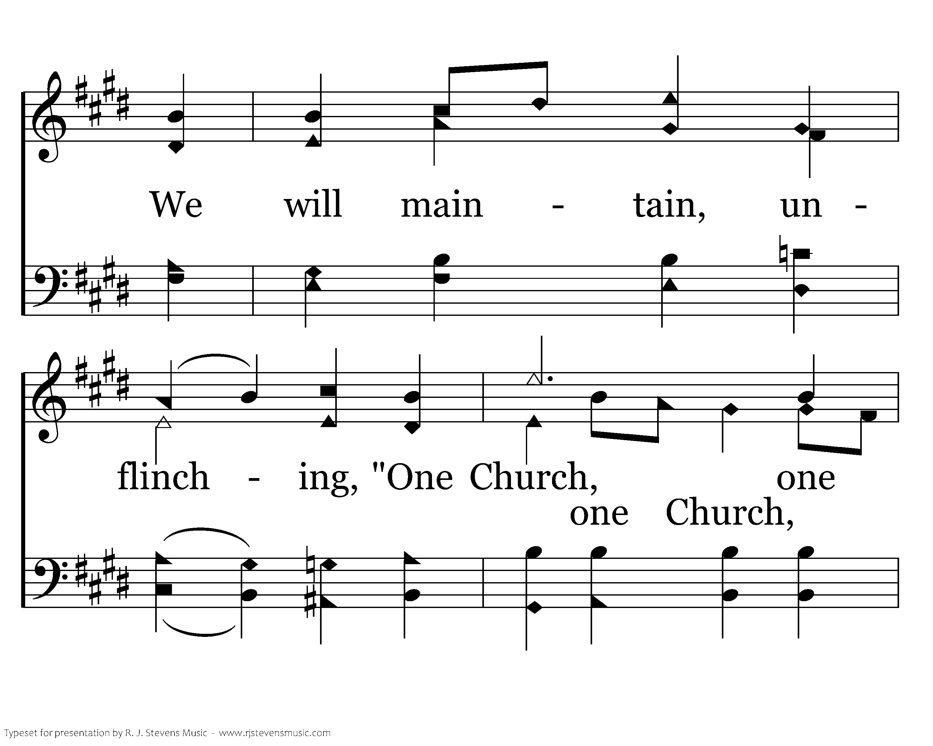 Not so: in God's deep counsels Some better thing is stored: We will maintain, unflinching, "One Church, one Faith, one Lord."