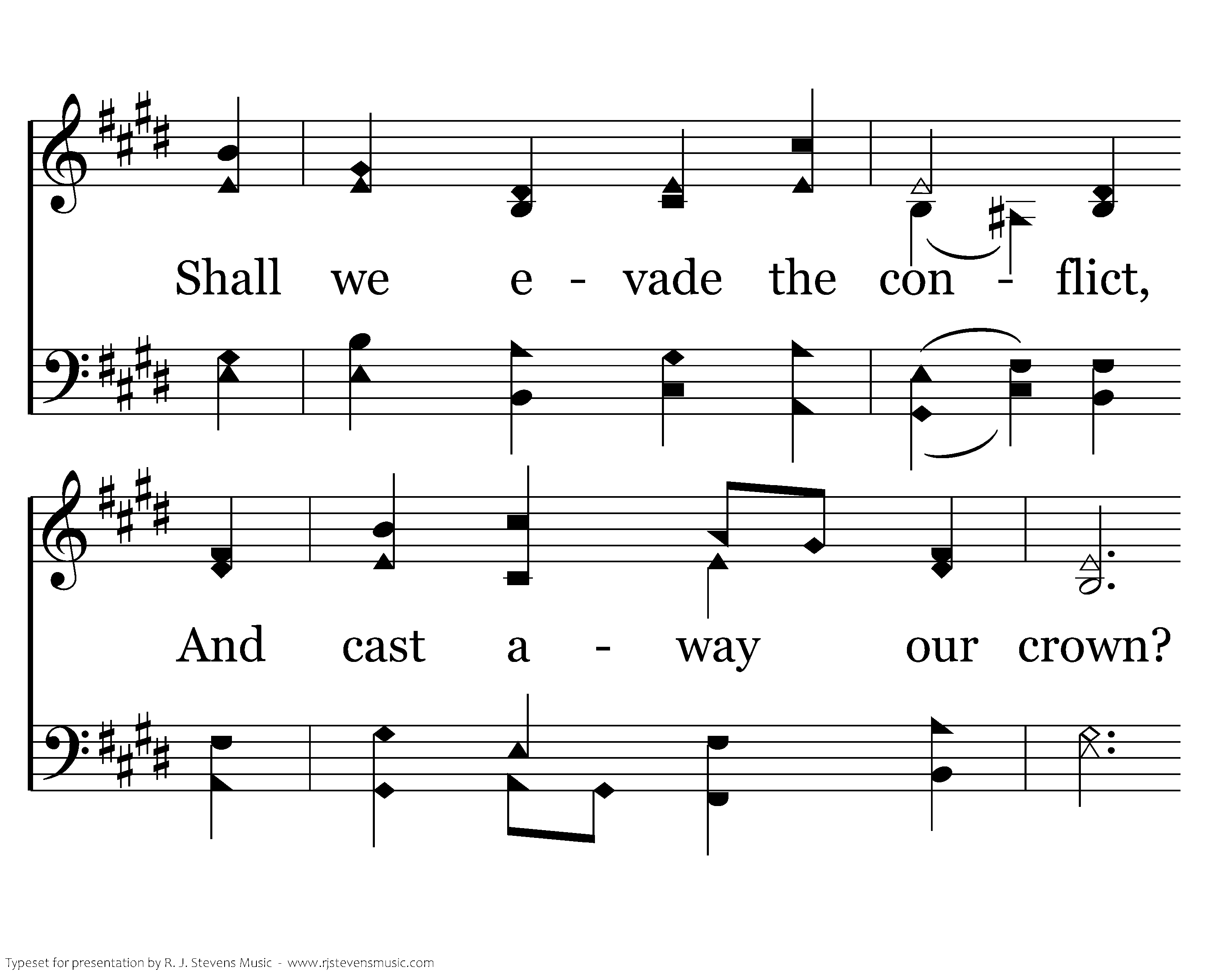 And we, shall we be faithless? Shall hearts fail, hands hang down? Shall we evade the conflict, And cast away our crown?