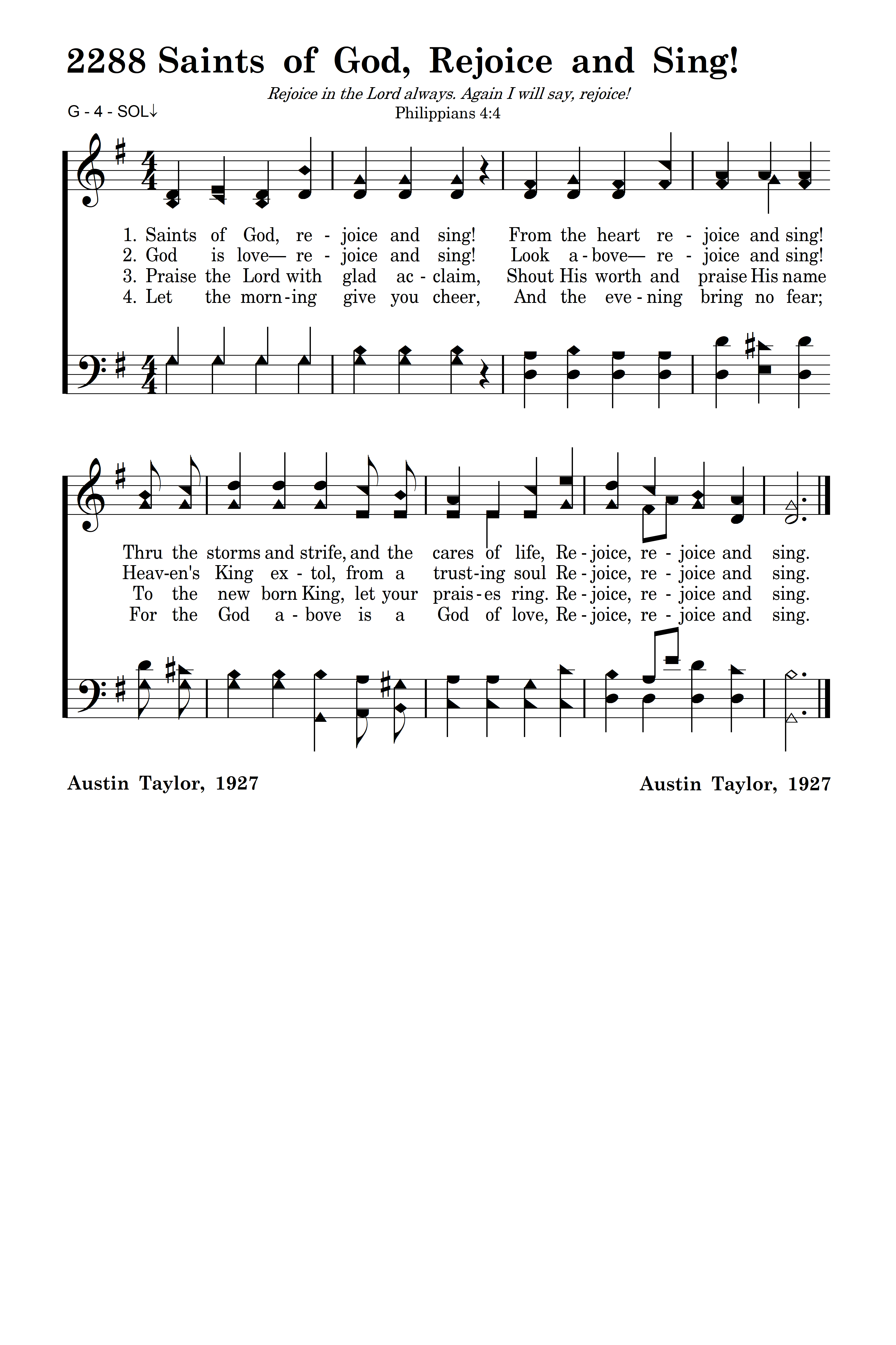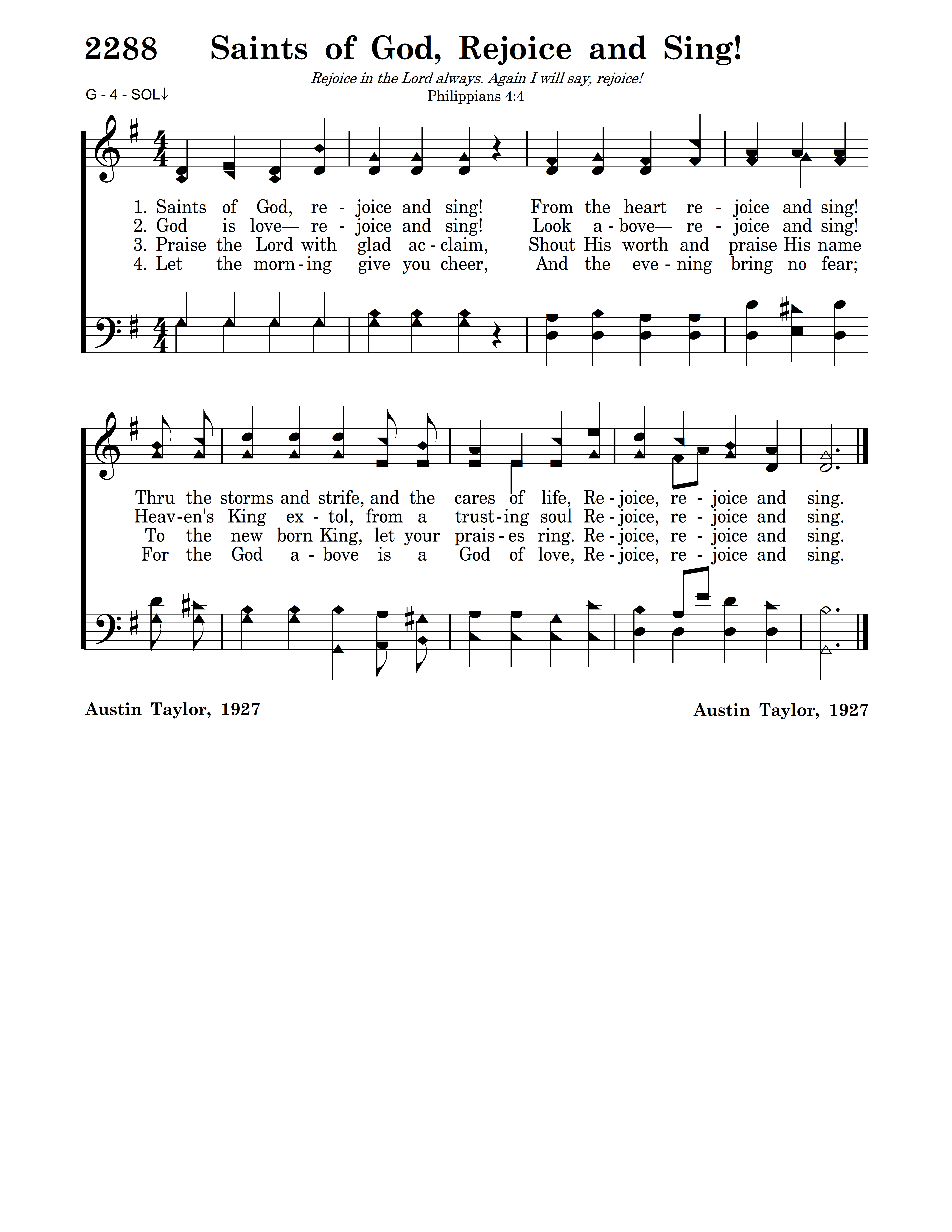 Saints of God, rejoice and sing! From the heart rejoice and sing! Thru the storms and strife, and the cares of life, Rejoice, rejoice and sing.