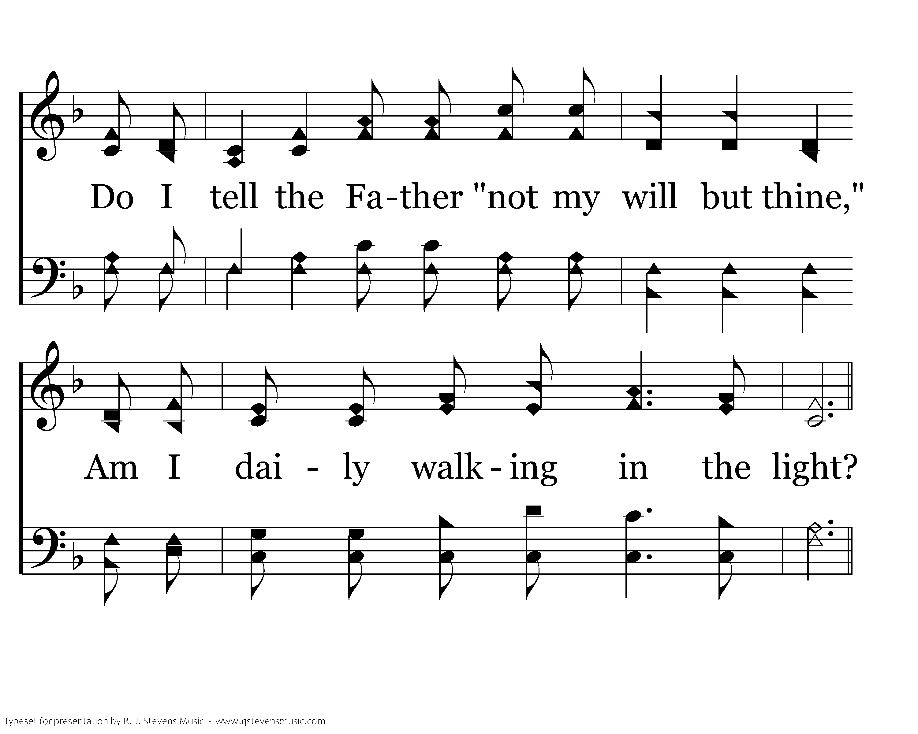 Does my life bear the fruit of God's willdivine, Does my light shine brightly in the night? Do I tell the Father "not my will but thine," Am I daily walking in the light?