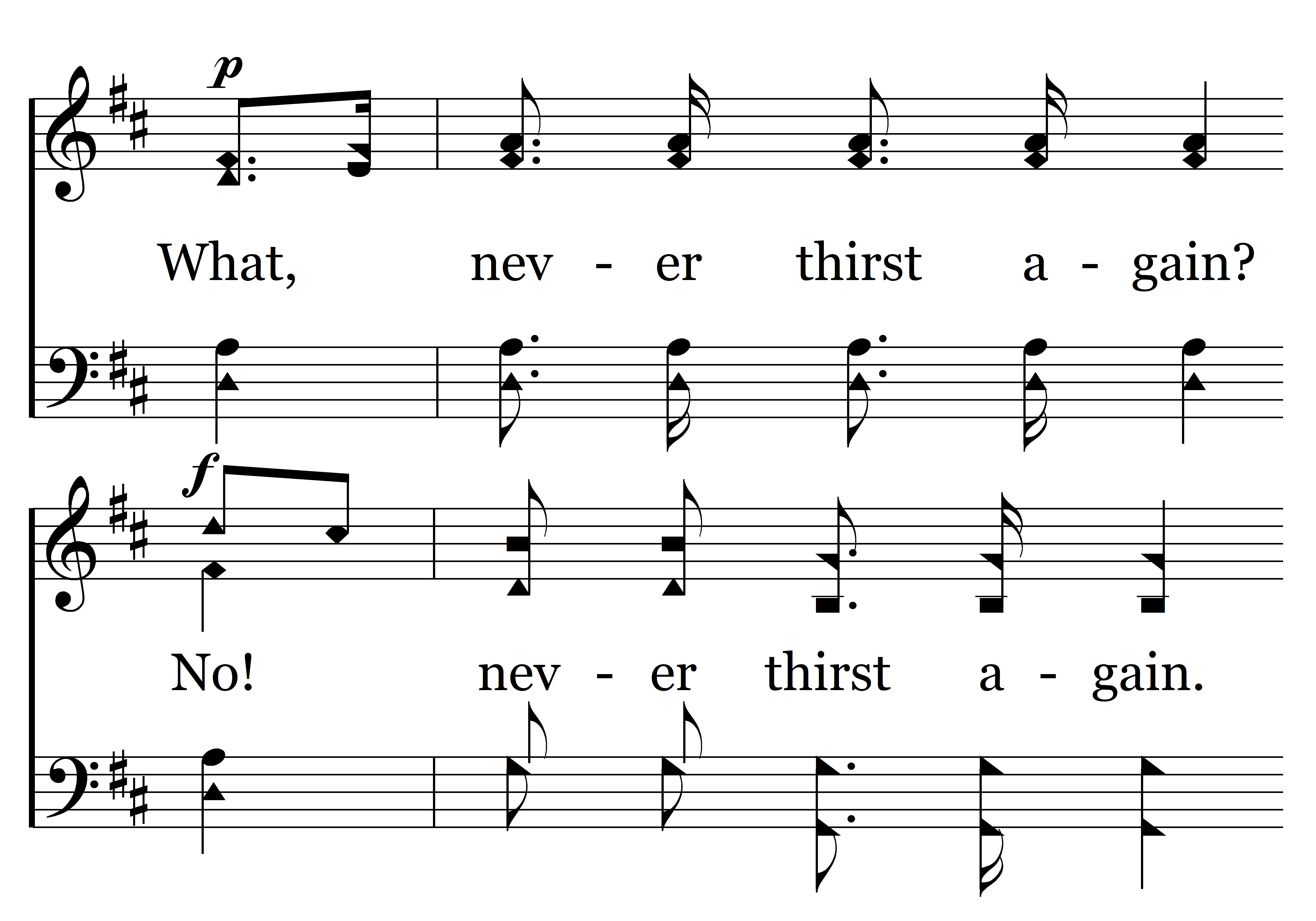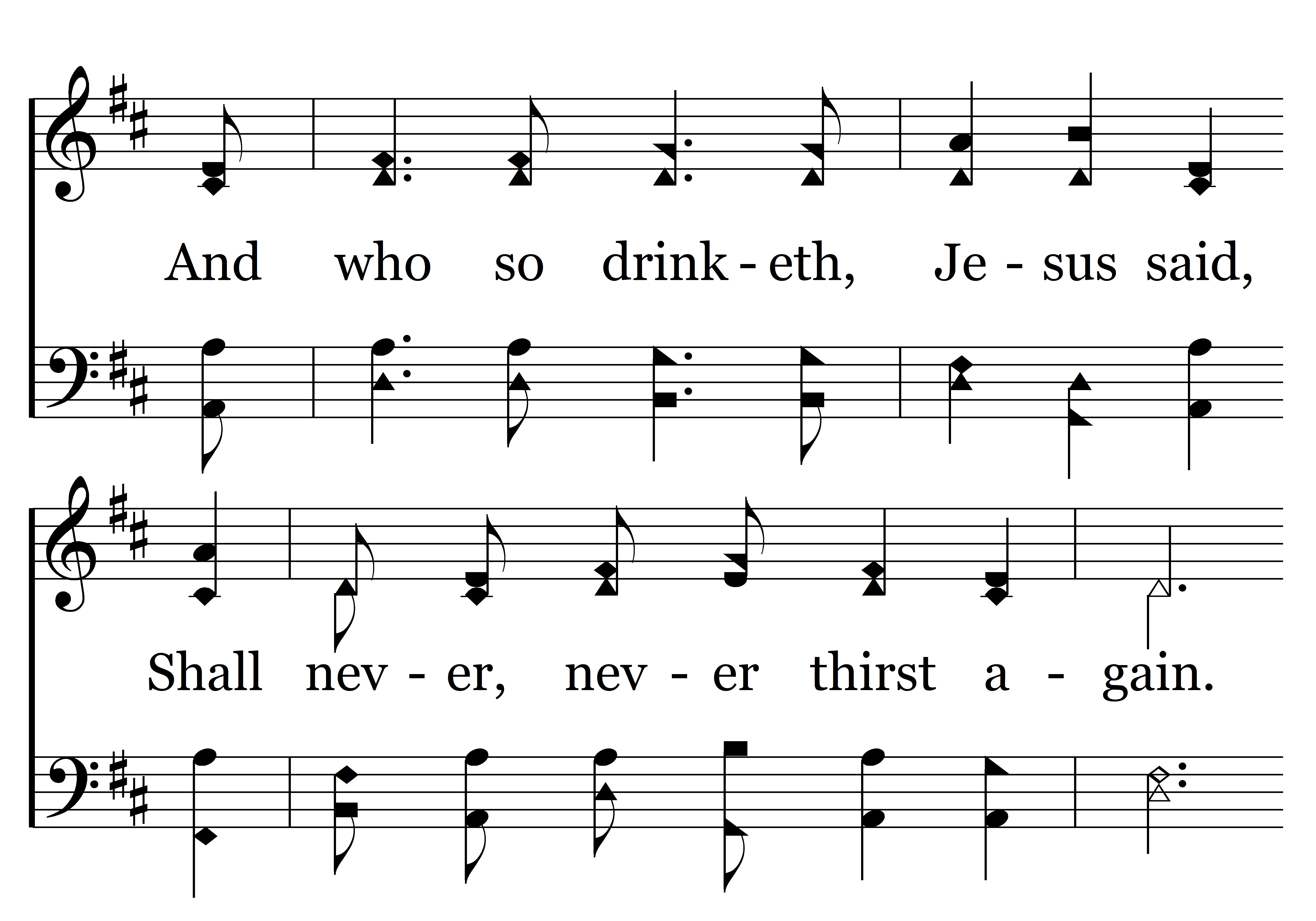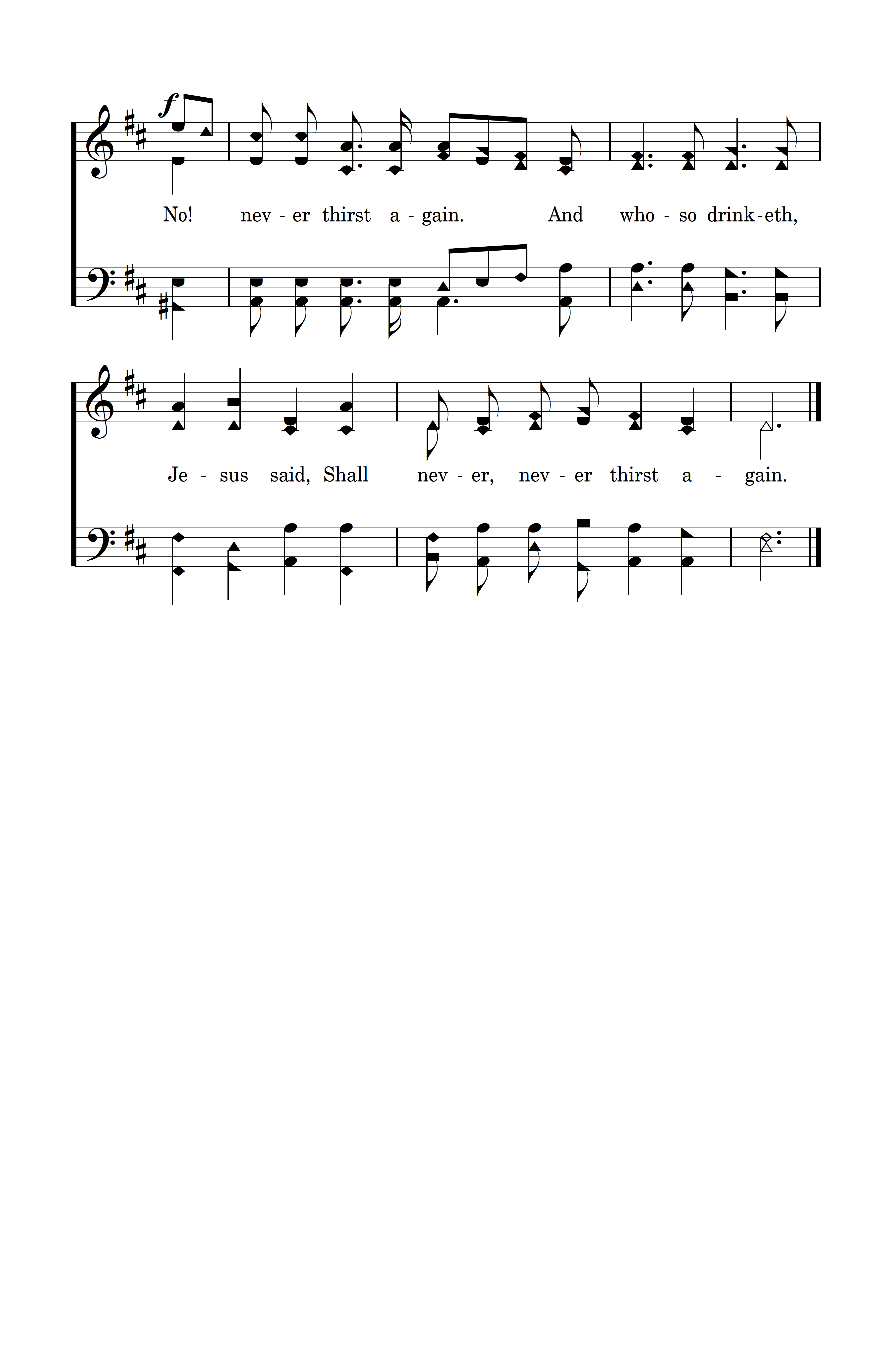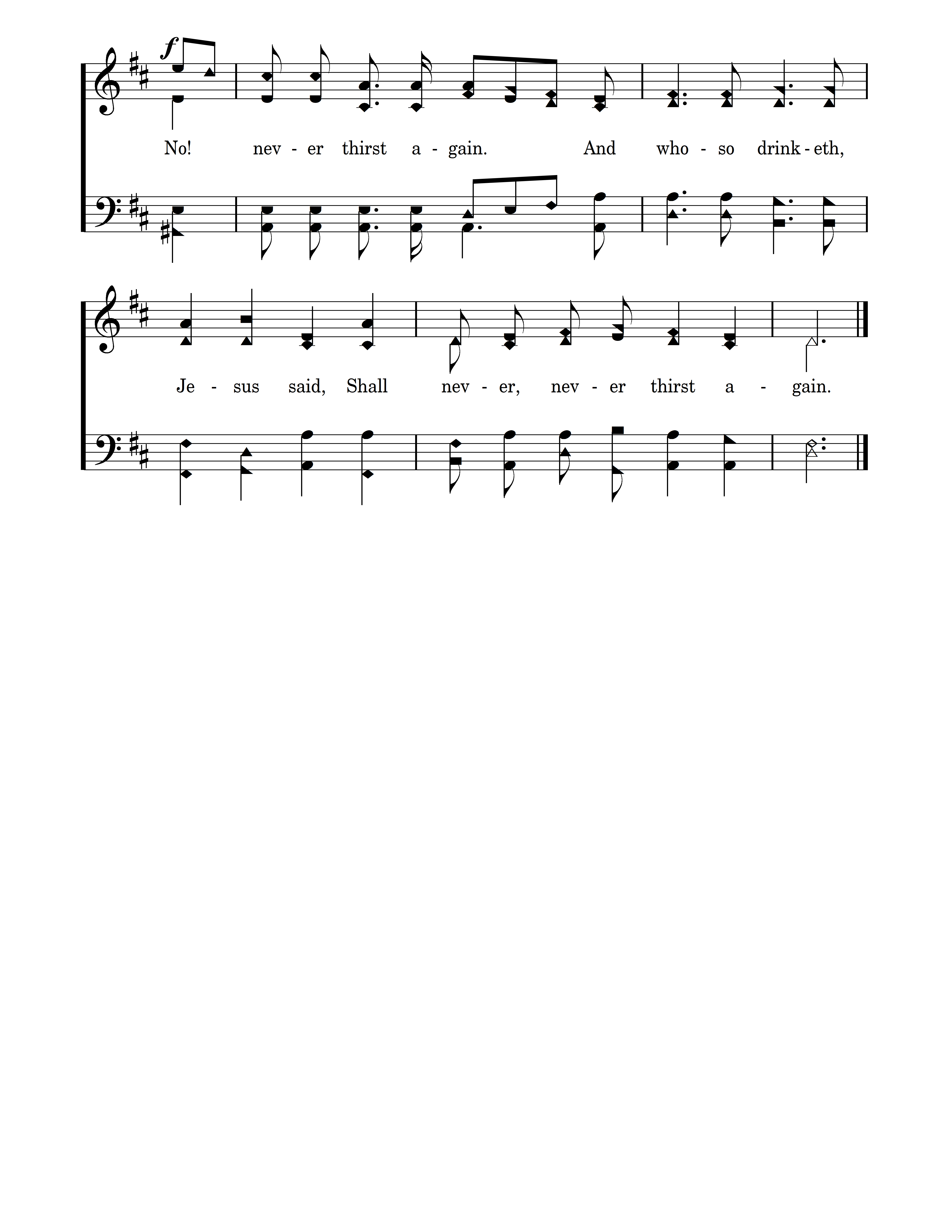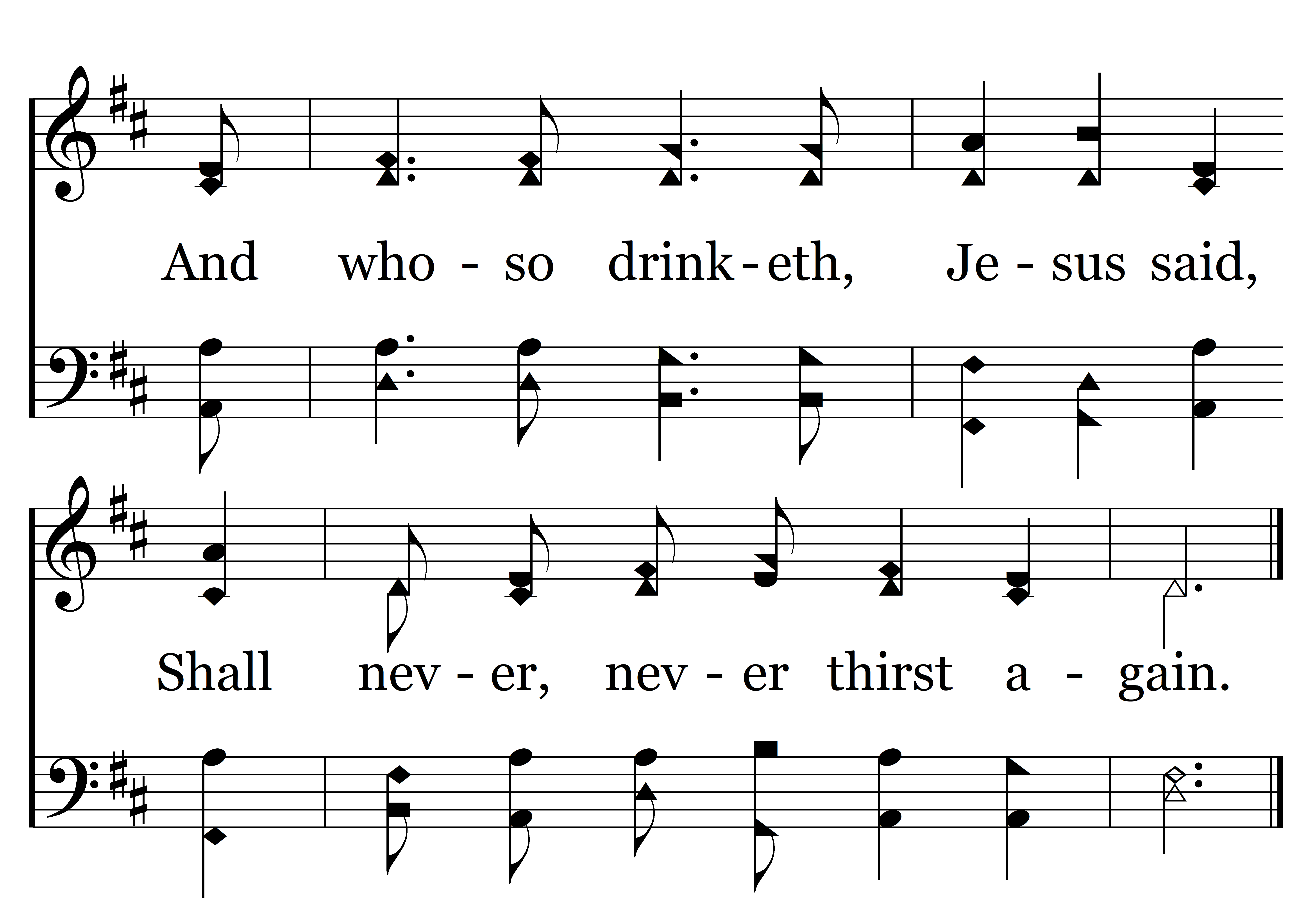 Shall never, never thirst again. What, never thirst again? No! never thirst again. What, never thirst again? No! never thirst again. And whoso drinketh, Jesus said, Shall never, never thirst again.