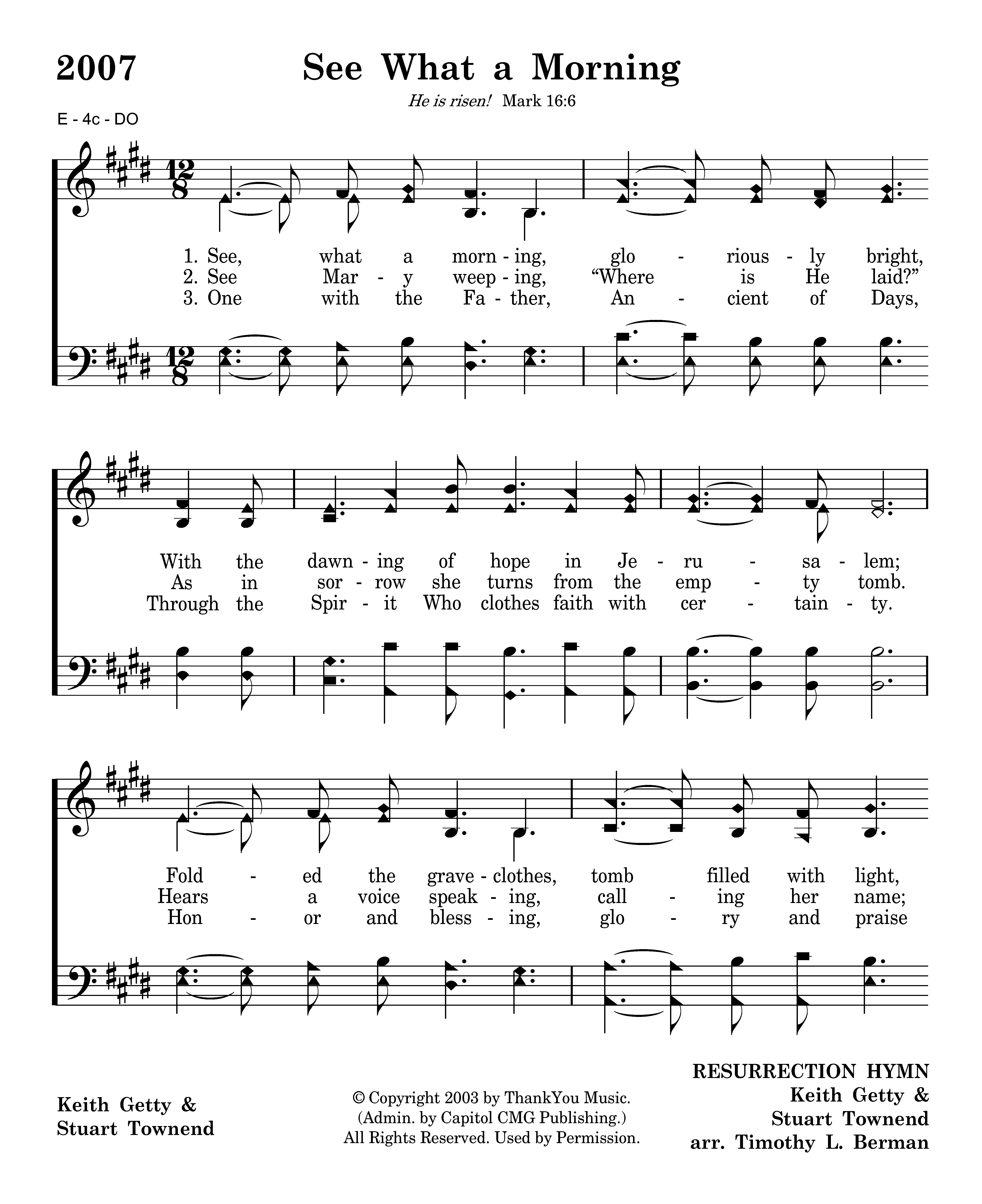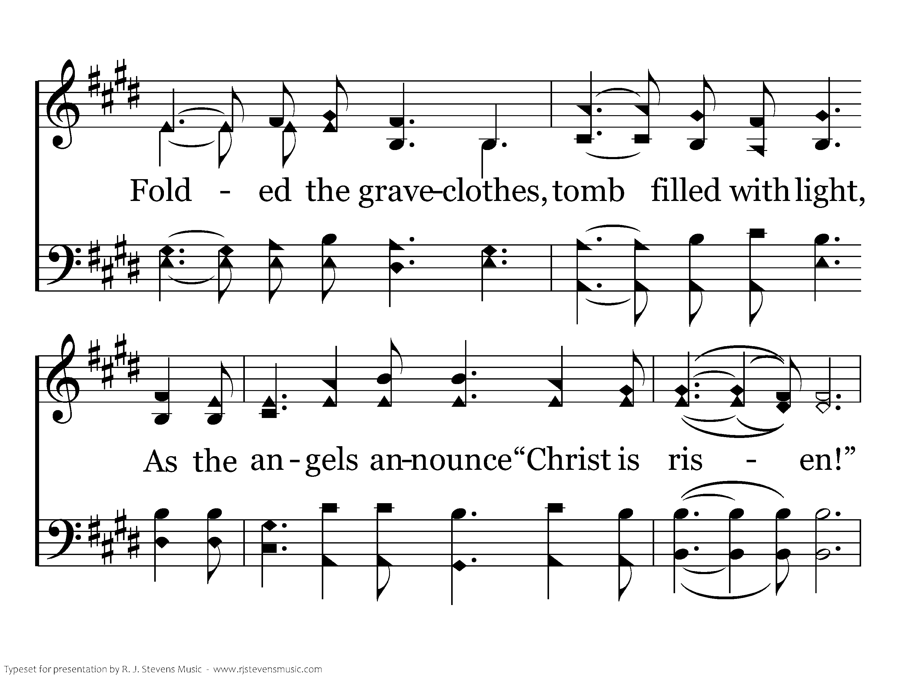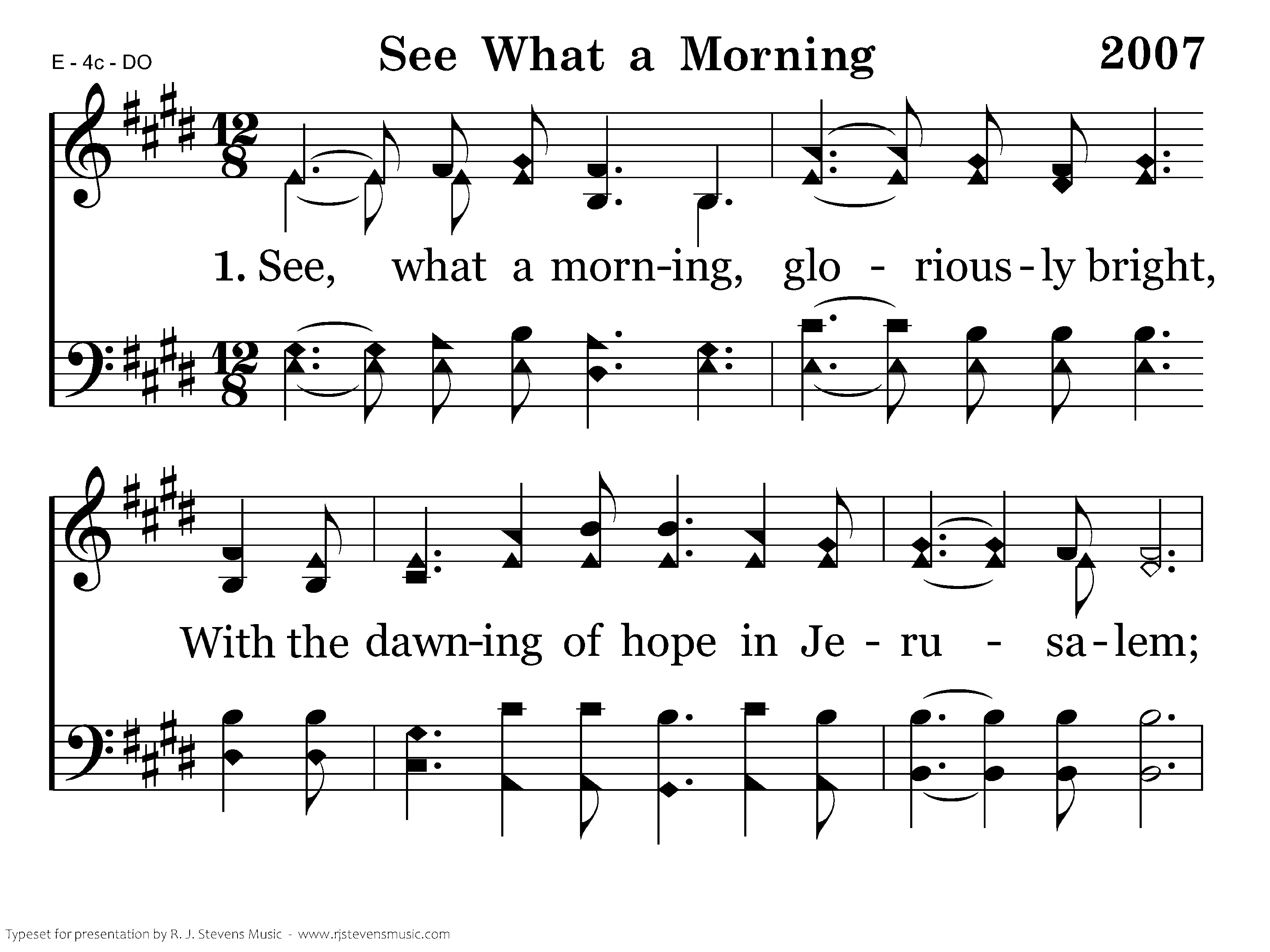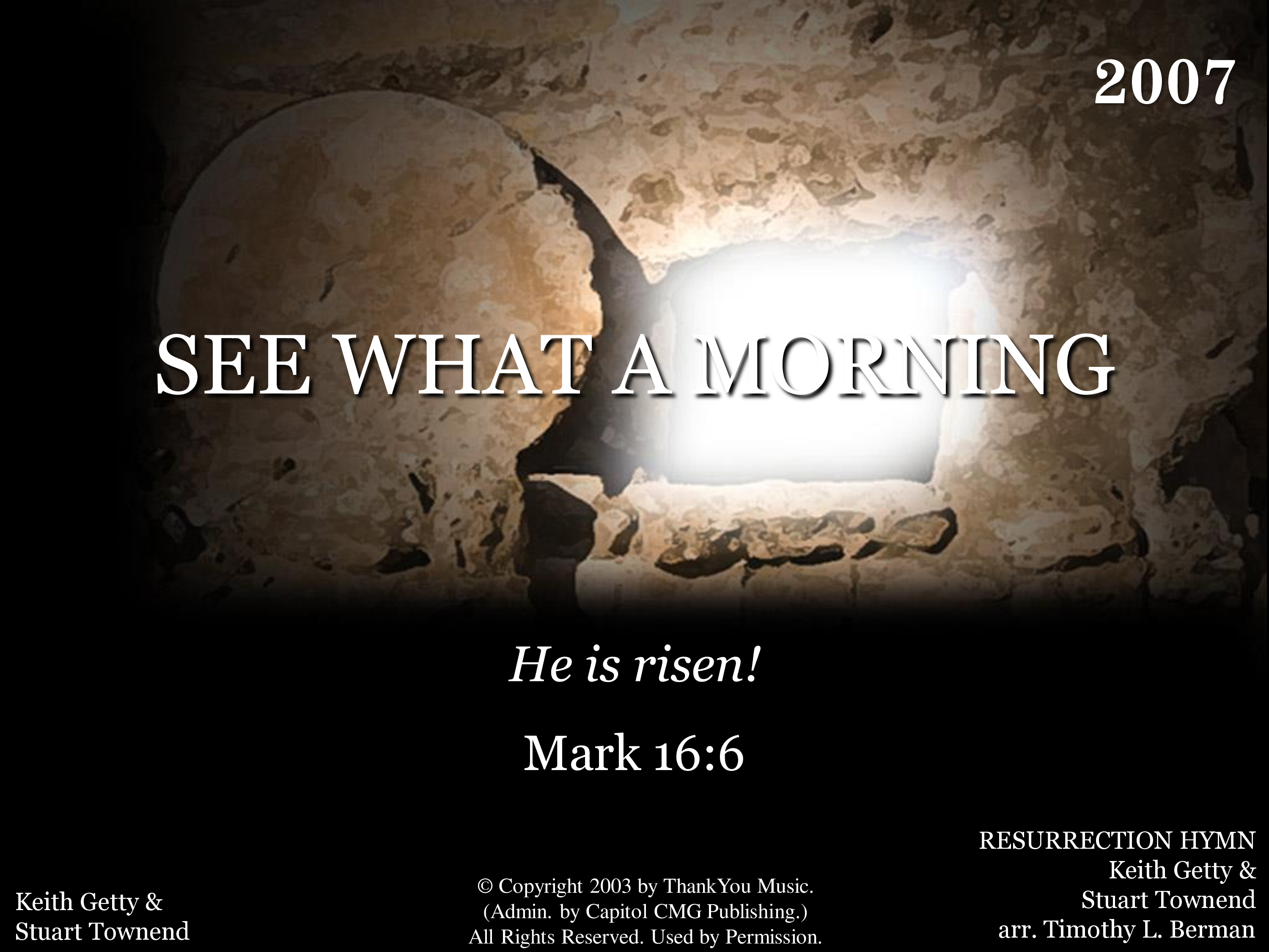 See, what a morning, gloriously bright, With the dawning of hope in Jerusalem; Folded the grave clothes, tomb filled with light, As the angels announce “Christ is risen!” See God’s salvation plan, wrought in love, borne in pain, Paid in sacrifice, fulfilled in Christ the Man, for He lives— Christ is risen from the dead!