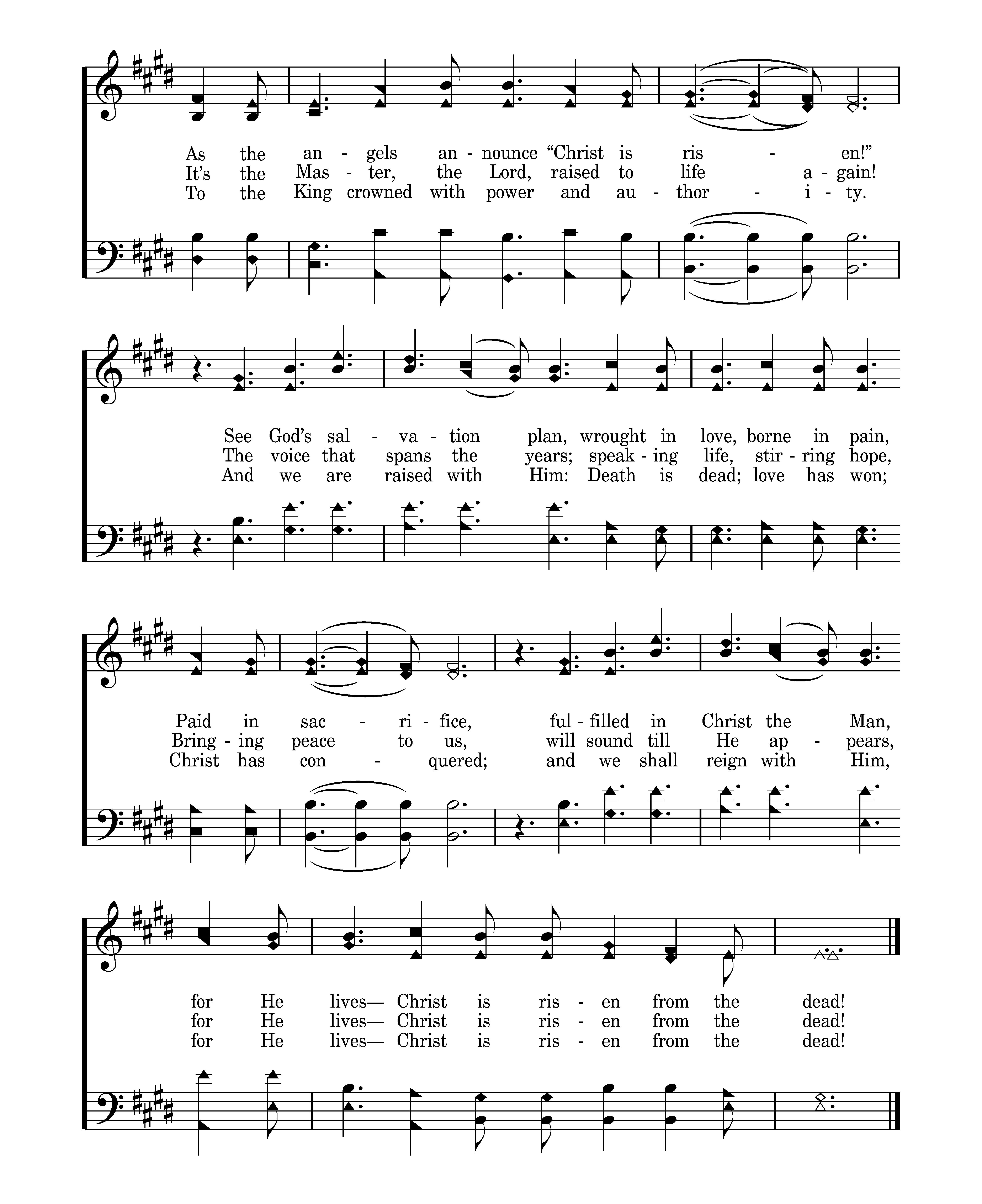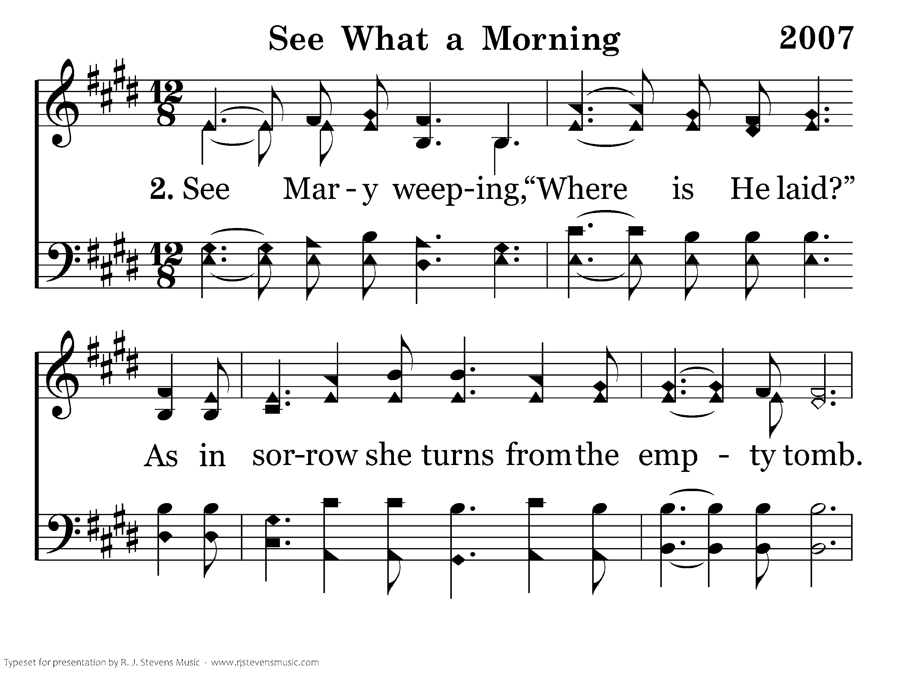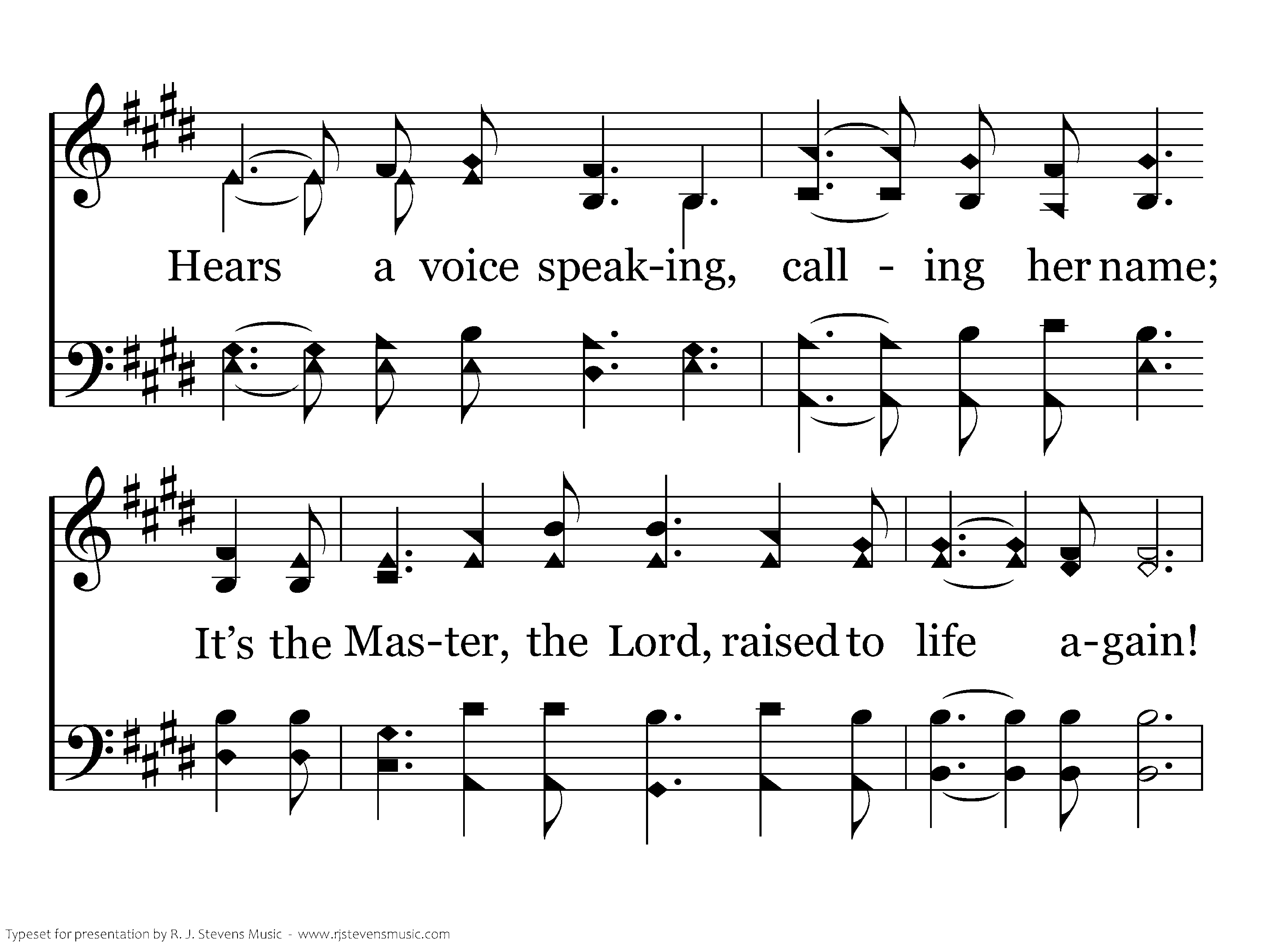 See Mary weeping, “Where is He laid?” As in sorrow she turns from the empty tomb. Hears a voice speaking, calling her name; It’s the Master, the Lord, raised to life again! The voice that spans the years; speaking life, stirring hope, Bringing peace to us, will sound till He appears, for He lives— Christ is risen from the dead!