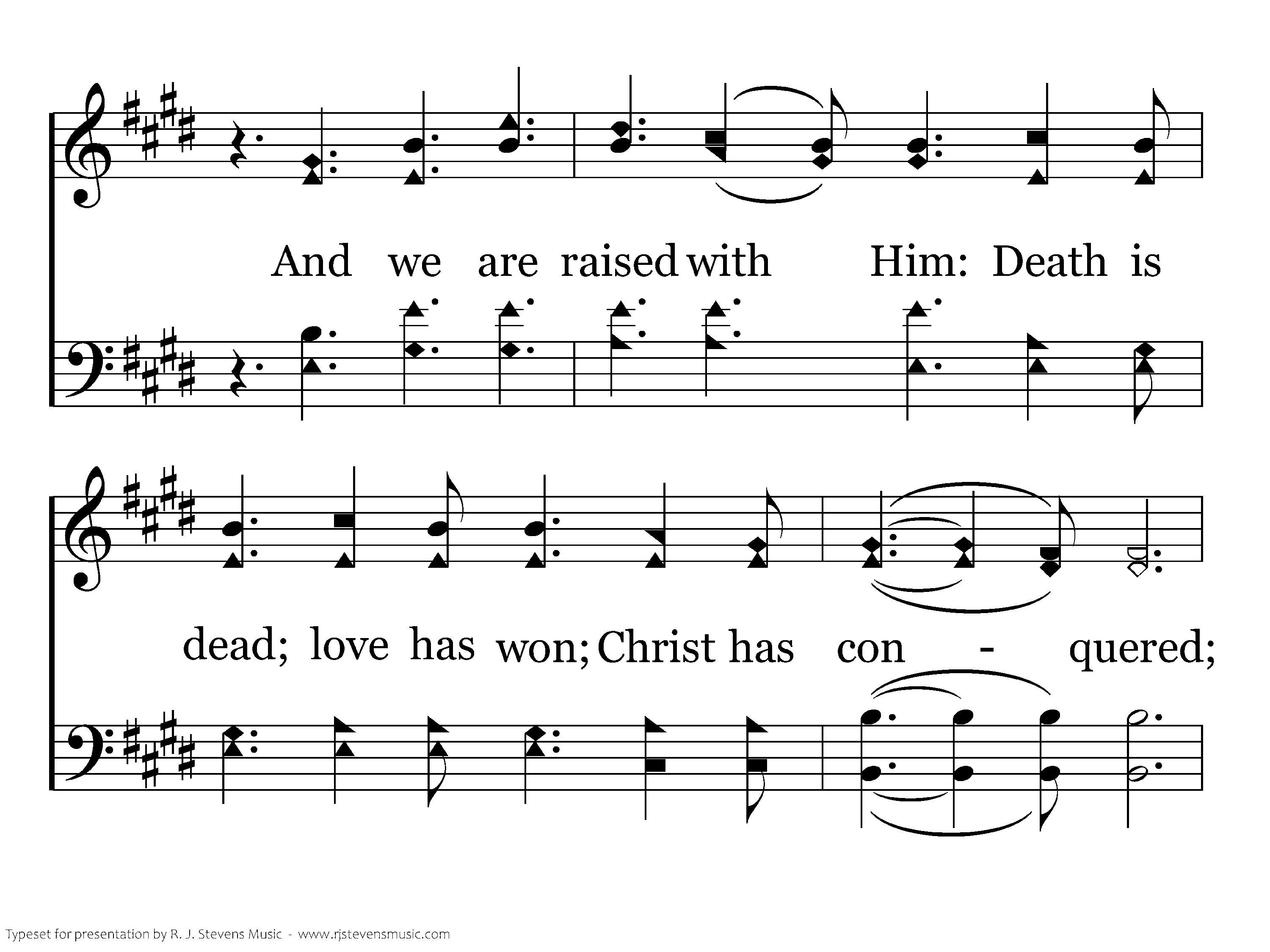 One with the Father, Ancient of Days, Through the Spirit Who clothes faith with certainty. Honor and blessing, glory and praise To the King crowned with power and authority. And we are raised with Him: Death is dead; love has won; Christ has conquered; and we shall reign with Him, for He lives— Christ is risen from the dead!
